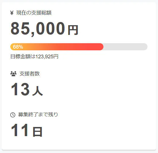 現在の調達率は68%、パトロン様は13名となっております。