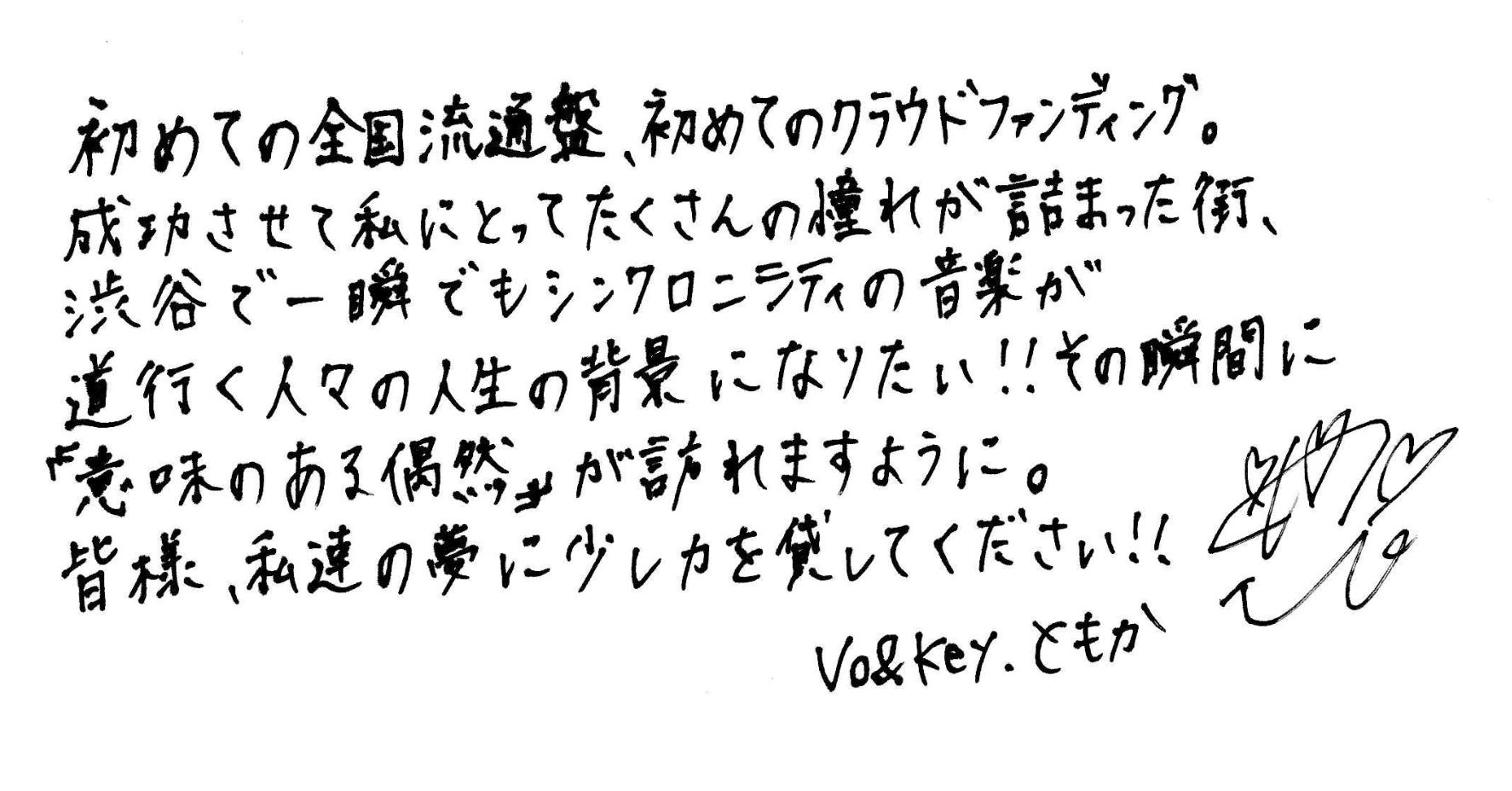 シンクロニシティを結成して早6年、幾度かのメンバーチェンジ、脱退などを経てきましたが応援してくださる各地の皆様、ライブハウス関係者の皆様、そして共に演奏してくれるサポートドラマー達にも助けられここまで活動することができ、7年目にして初の全国流通盤音源をHi-PLY RECORDSより発売することになりました。