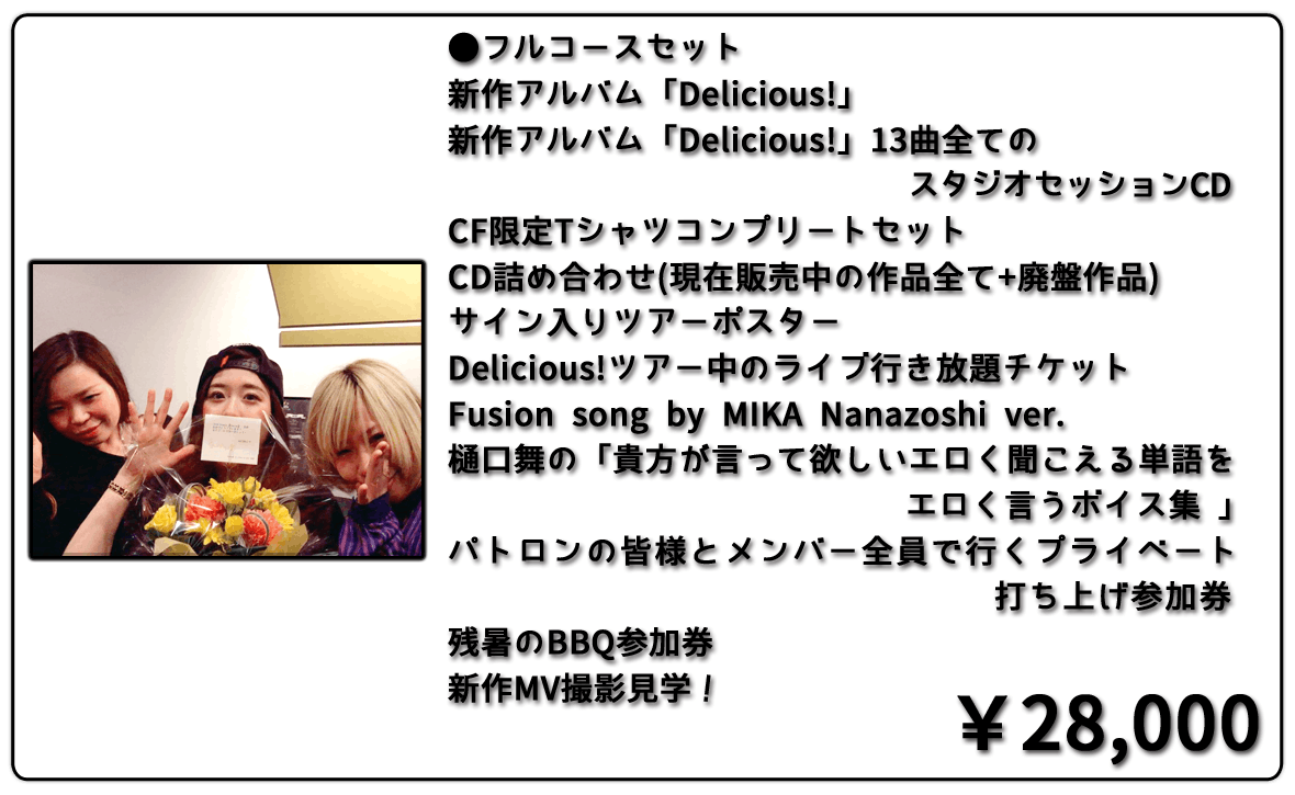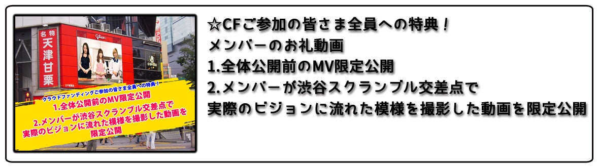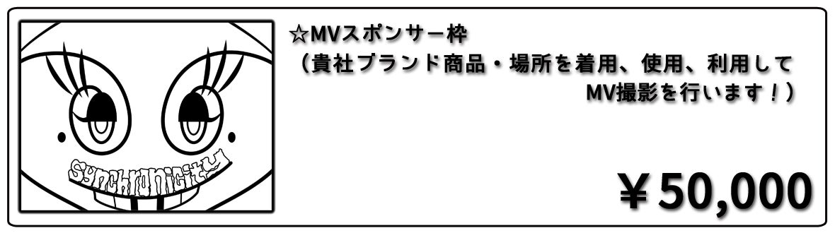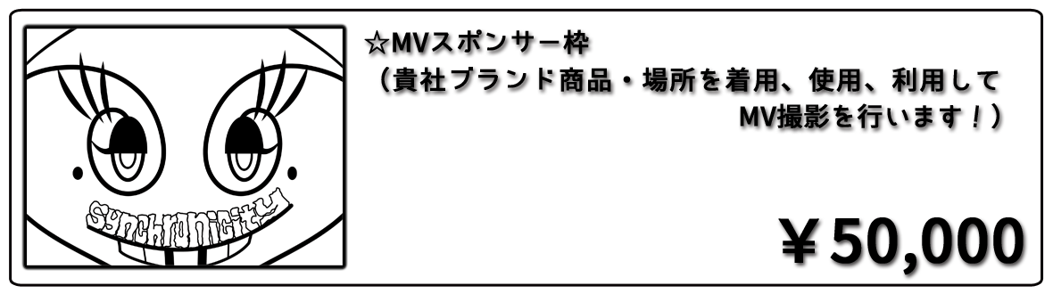 今回募集するスポンサー枠とは、我々のMV制作に関わる衣装や、音響・楽器機材、撮影場所等の提供をして頂き、それをメンバーが着用・使用・利用したMVを撮影し、そのMVをビジョンに放映することによって貴社のプロモーションの場としてもご利用頂ける、という枠です。リターンを頂いた際はもちろん、ビジョンに映すことを前提としたカットでMV撮影をさせて頂きますので、御社の商品・場所が映るカットで撮影をさせて頂けるよう撮影ディレクションから入って頂くことも可能です。