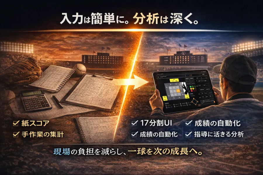 左右別、コース17分割、球種入力などの詳細分析を、単なるデータ表示で終わらせず、監督の指導や選手の課題発見に、より落とし込みやすい形へ進化させます。