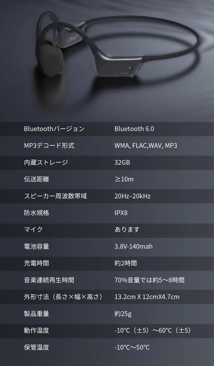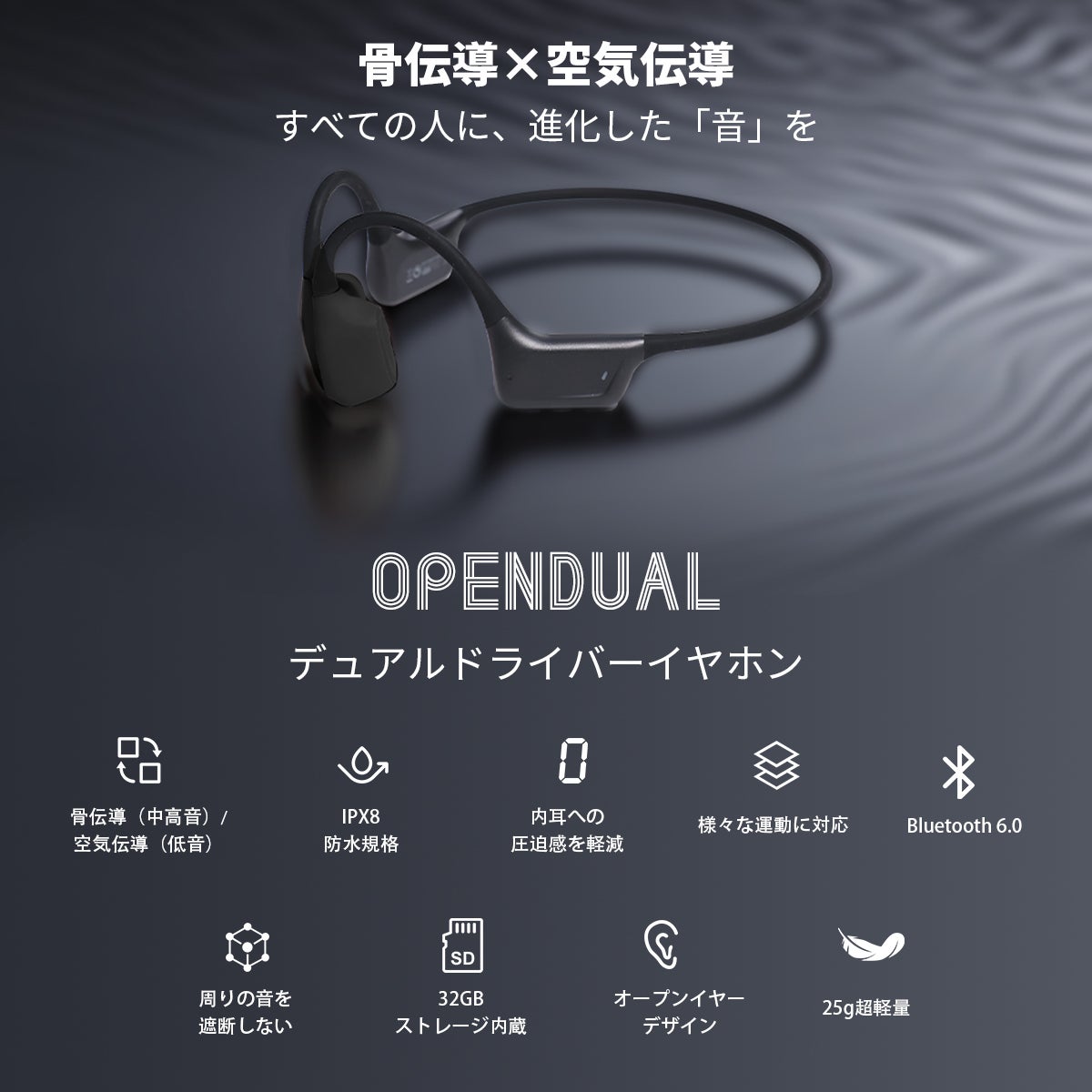 おすすめポイント:①IPX8防水に対応した骨伝導×空気伝導デュアルドライバー同時搭載のワイヤレスイヤホン②【デュアルドライバー搭載】骨伝導の振動によるクリアな中高音域と、空気伝導の豊かな低音域を融合③【2Way再生】32GB内蔵ストレージ&Bluetooth 6.0の2つの再生モードを切替可能
