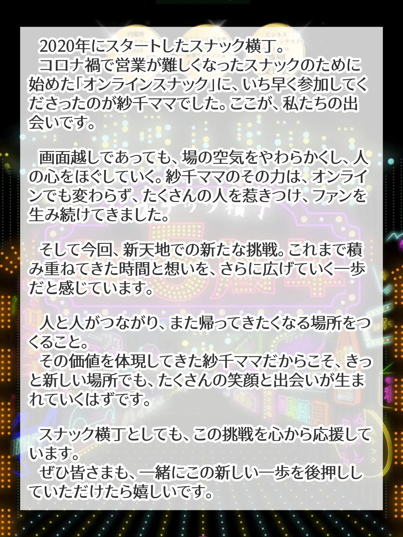 2019年に現テナントに移り1年経たずコロナ禍へ…路頭に迷ってた際に商業オンライン飲みの存在を知りオンラインスナック横丁へ加盟させていただきました。全国各地、はたまた世界のあちこちから集った人々と画面越しでも存分に喋って飲んで、夜な夜な飲み明かしたのは良い思い出です。スナック女子・五十嵐さんのお蔭で得難い経験と出会いをいただきました。これからもお世話になります!