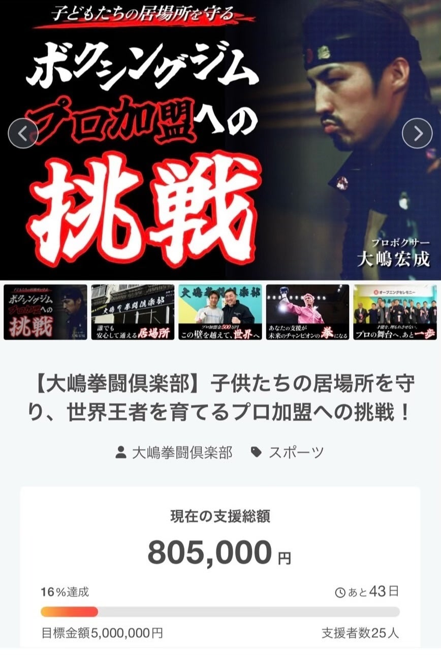| 1st Goal | 500万円 | 【JBCプロ加盟金として全額を充当】 大嶋拳闘倶楽部がJBCにプロ加盟するための費用。世界を目指す選手育成の第一歩となるスタートラインです。 |