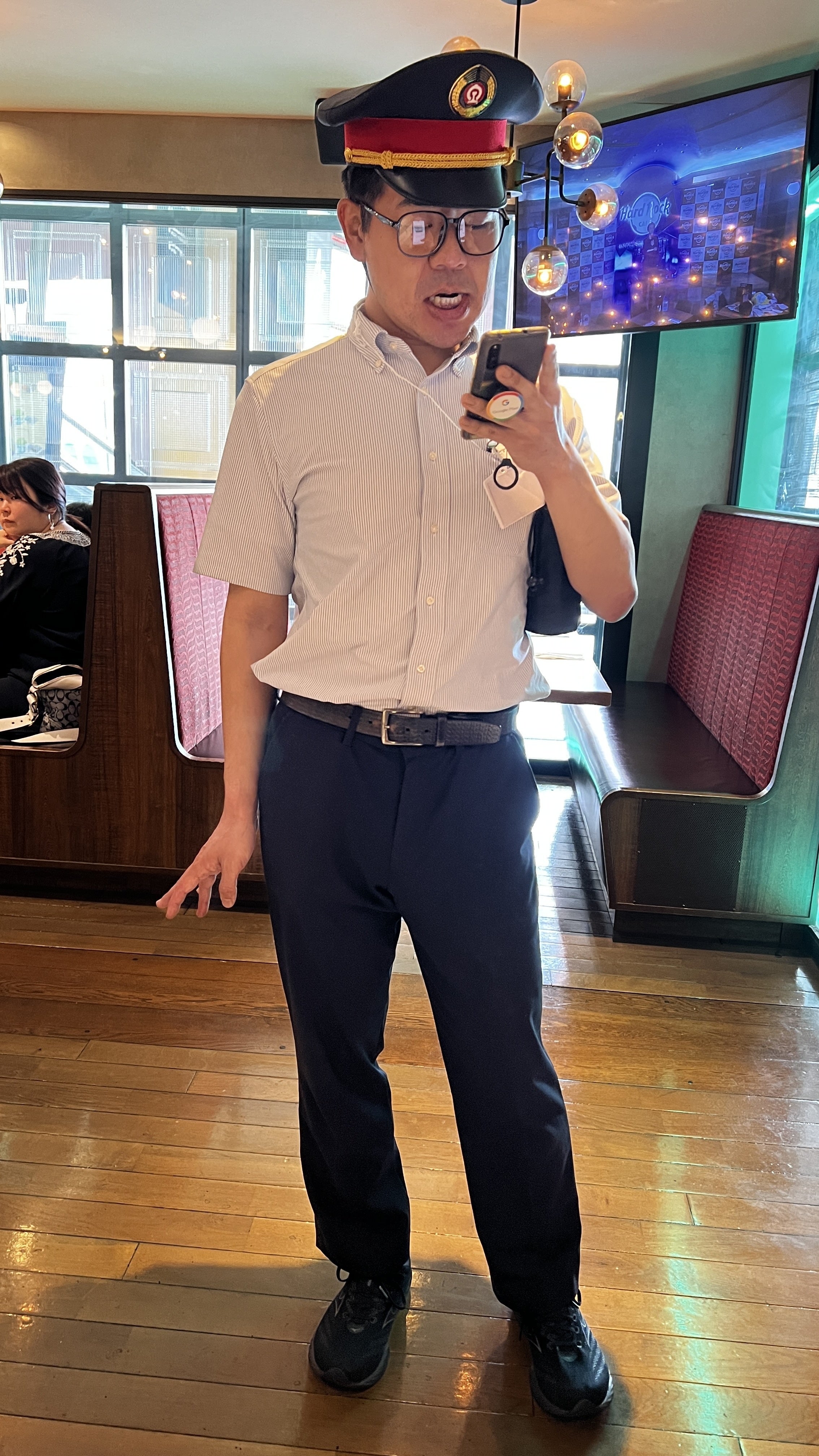 今回最下位、わたしの推しトレインコンダクターDPさん。ダイアモンドパワーという変身ヒーローの姿を封印し、東京大会で魅せた山田パワロ耕一というサッカー選手のような姿も封印し車掌さんスタイルで参加して下さいました。車掌さんコントのような色が強くめちゃめちゃ面白くて個人的には満点を上げたかったのですがエアギターの競技プレイとしては全然ダメったので厳しく採点させて頂きました。
