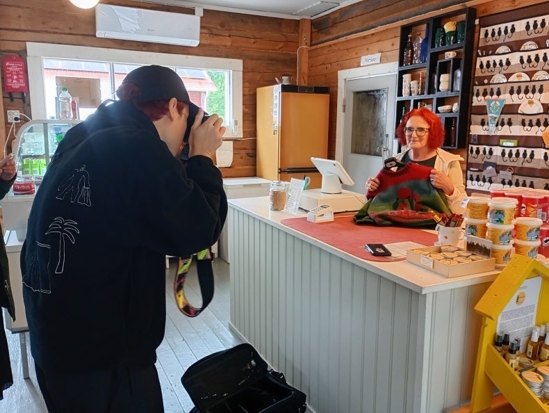 おみやげ屋さんでお気に入りのニットを見つけ興奮するじゅんじゅんさん。マダムの手作りだって!