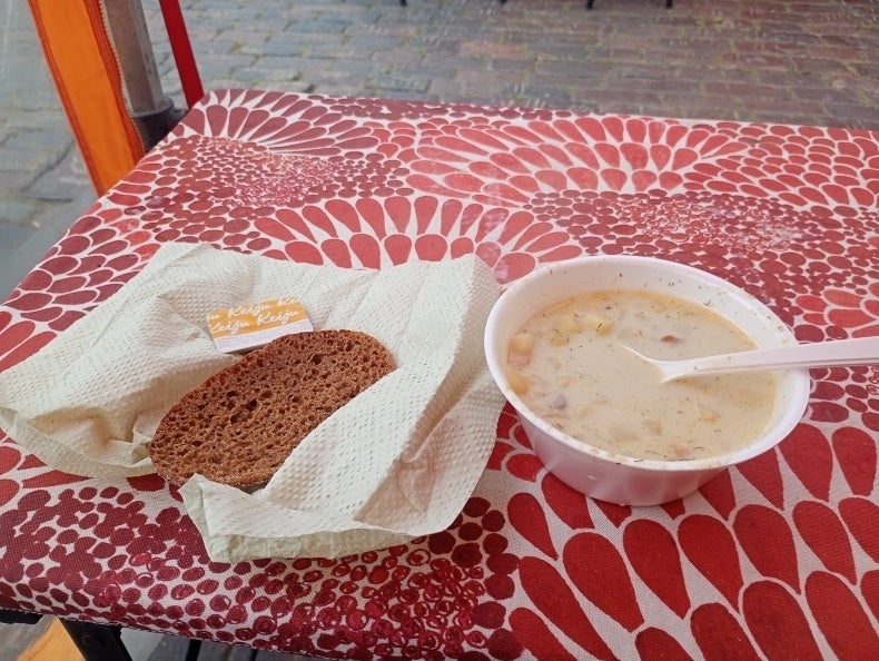 市場でサーモンスープ。めちゃんこおいしいよ!