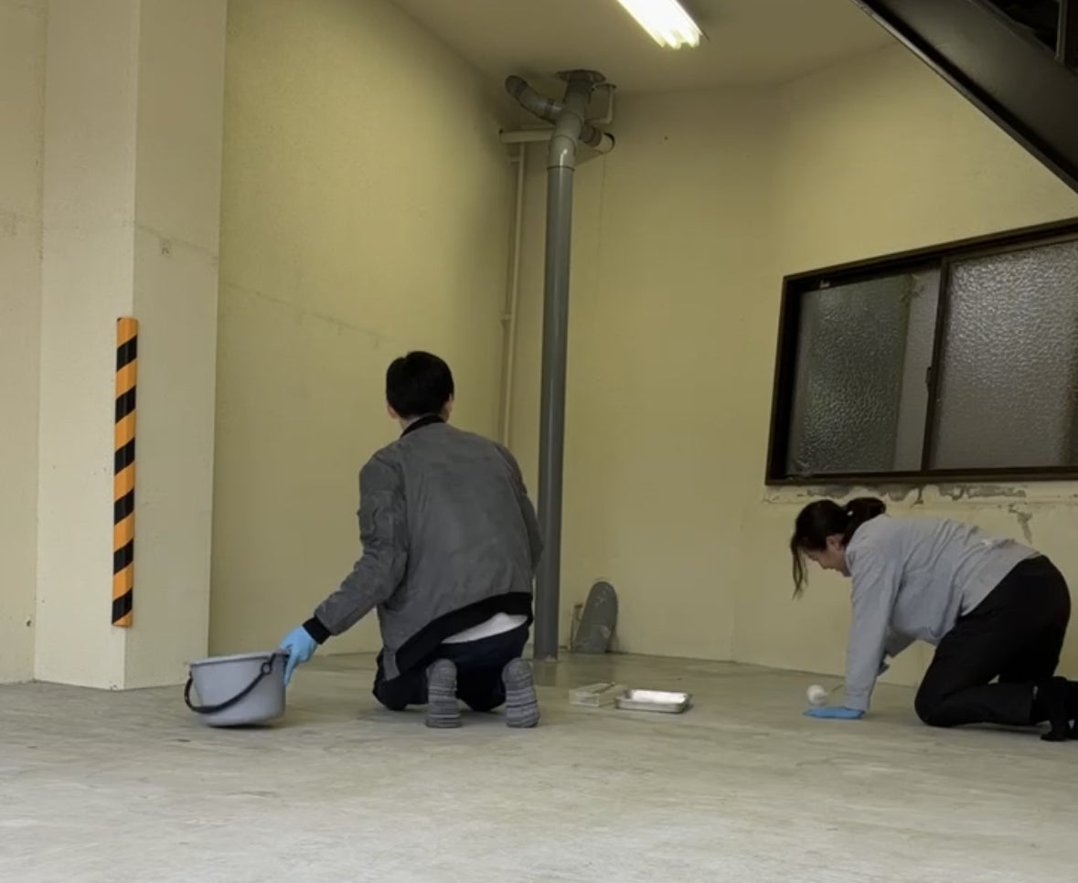 土間のクリア塗装は自分たちで塗り塗りしてコスト削減・・・
