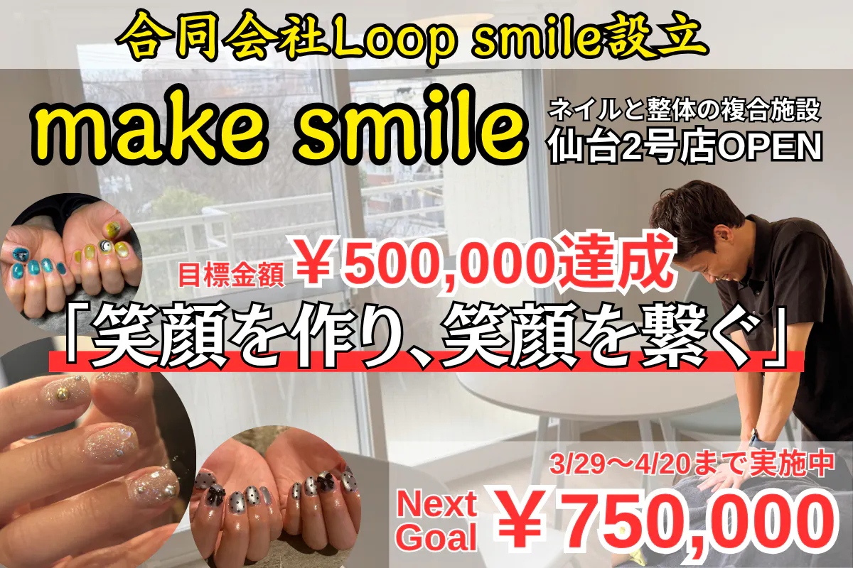 体の不調は、気持ちの落ち込みにもつながります。逆に、体が整うと気持ちもポジティブになる——整体の現場で何度も目の当たりにしてきた事実です。make smileでは、ネイルで気分を上げながら整体で体を整える、そんな「まるごとケア」が実現できます。宮城野の皆さんの「元気」と「笑顔」を守れる場所にしていきたいです。