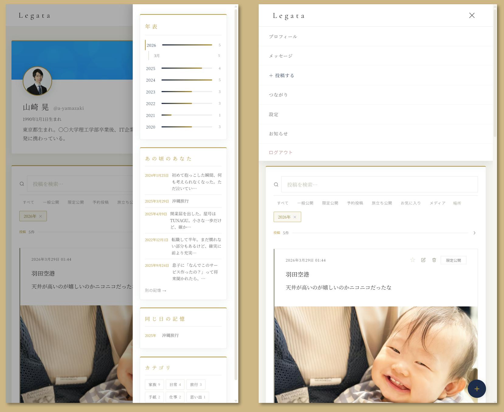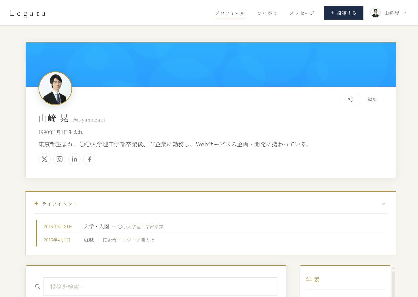 「未来の自分や誰かへ」という感覚で使う層。自分の思想・価値観・経験・実績を記録として残すことに意味を感じる層。日記やライフログの延長線上にLegataを置く。