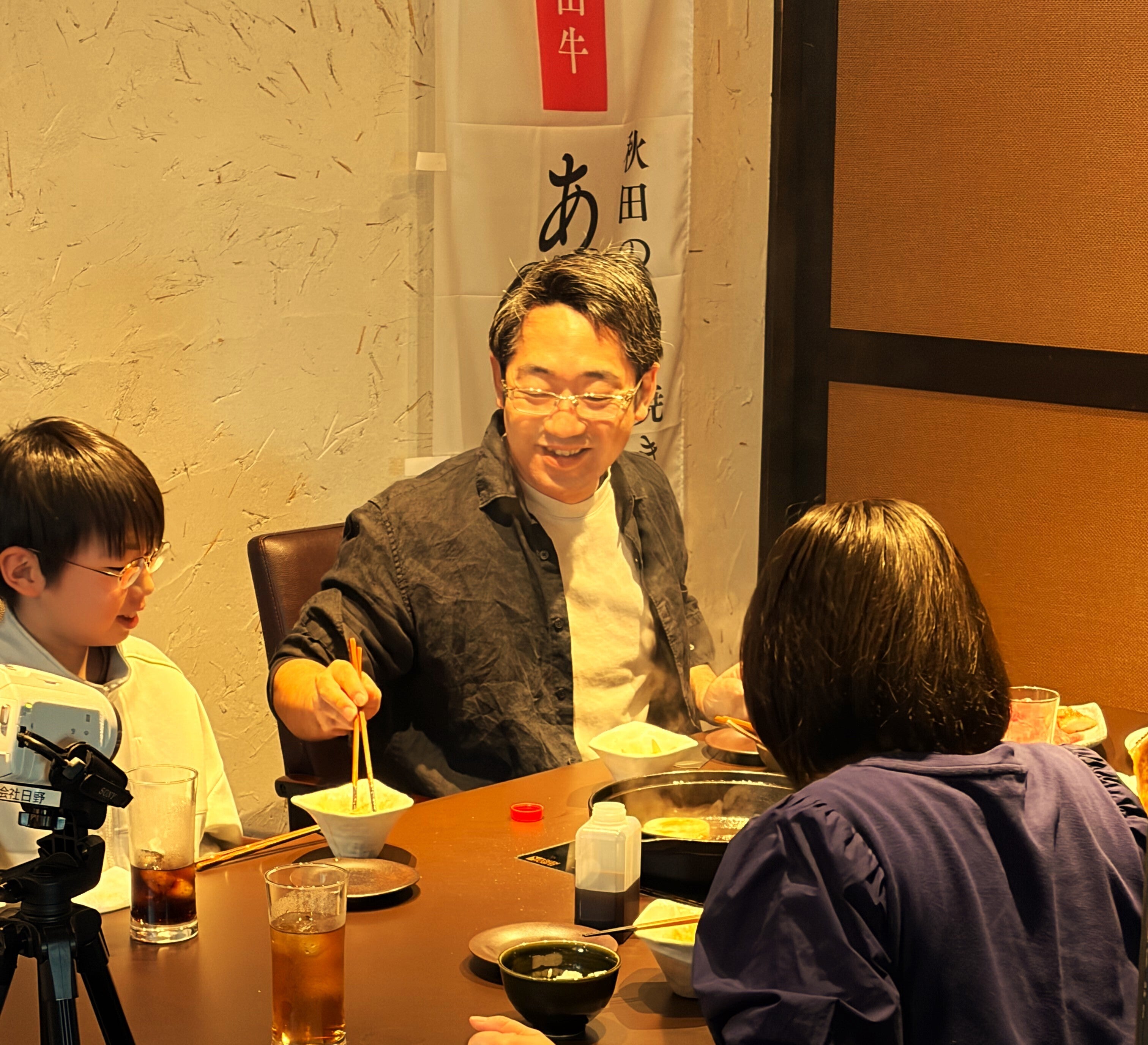 基本的に「あきたすき」は、始めにお父さんが秋田牛を一枚一枚焼いて家族へ手渡してゆきます。