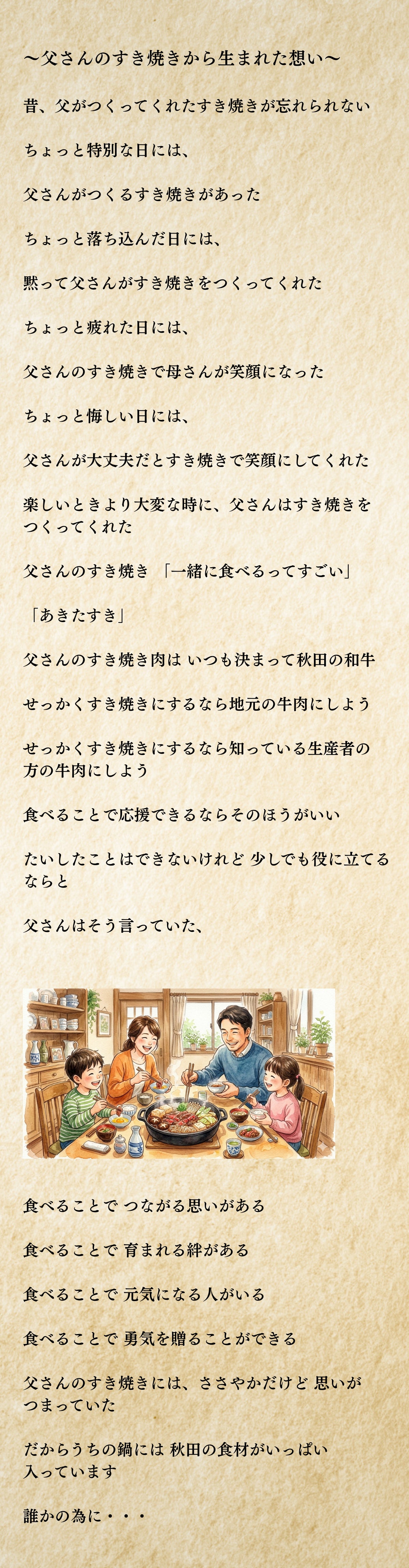 昔、父がつくってくれたすき焼きが忘れられません。楽しいときより大変な時に、父はすき焼きをつくってくれました。父さんのすき焼きに使う肉は、いつも決まって秋田の和牛。食べることで生産者を応援できるなら、知っている生産者の牛肉にしたい。ささやかだけど思いのつまった父さんのすき焼きから、私たちは学びました。