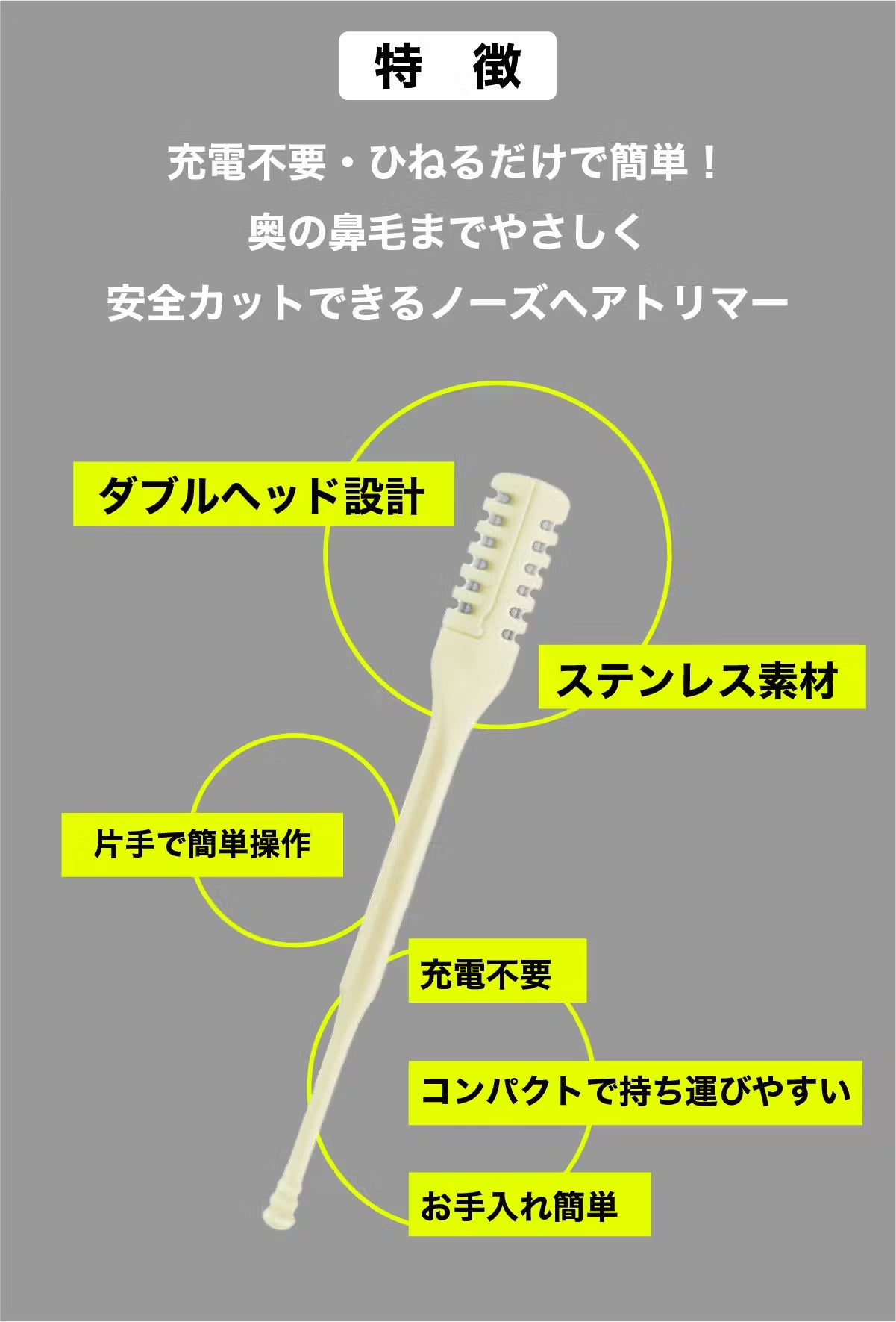 電気不要・ひねるだけで簡単!奥の鼻毛までやさしく安全カットできるノーズヘアトリマー。産毛や眉毛のお手入れにも。気になった時にサっとお手入れ。水洗いもできて清潔に保てます。