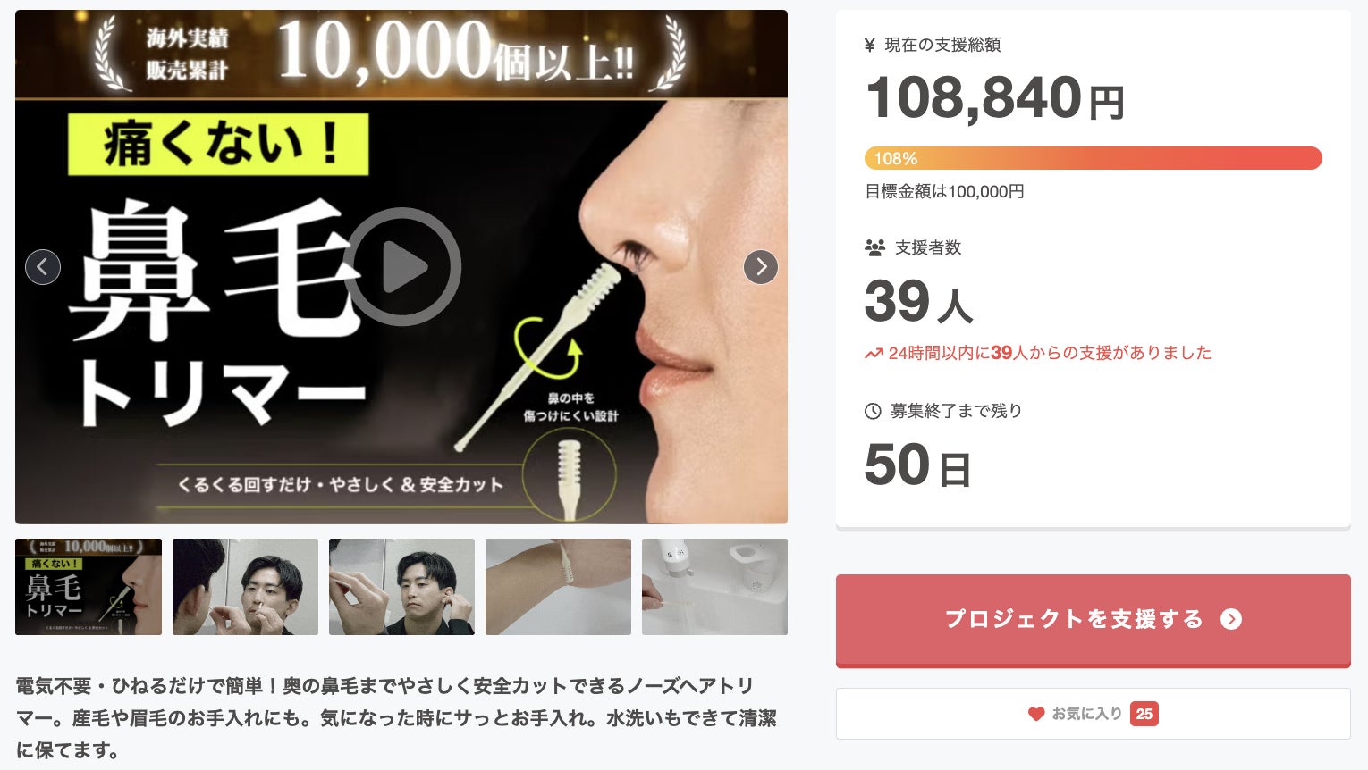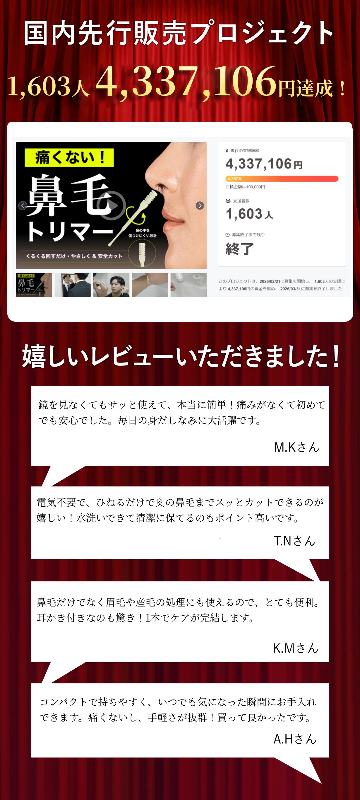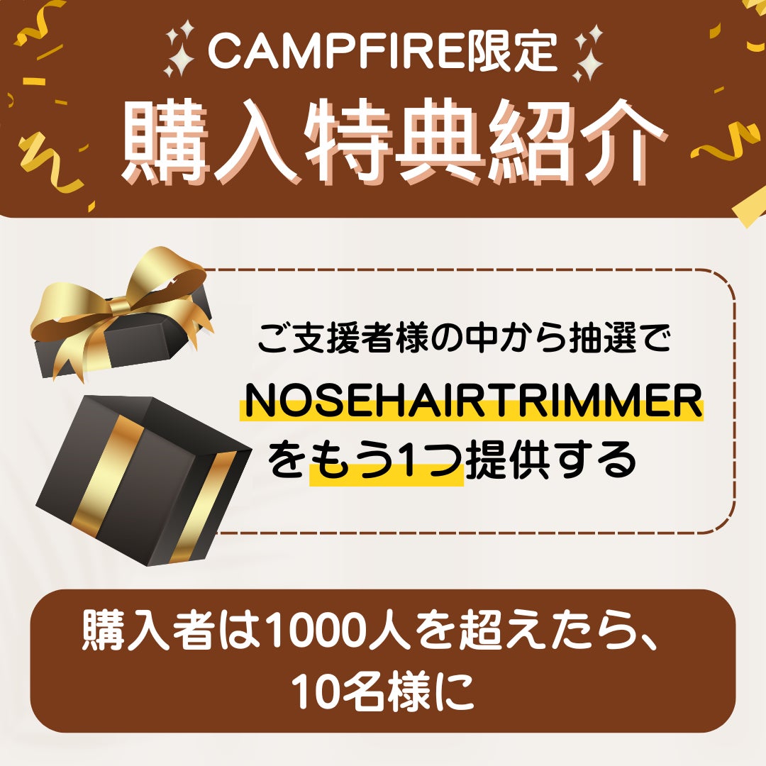大好評をいただき大成功したプロジェクトを記念して、CAMPFIREだけの購入者限定特別キャンペーンを実施します!ご支援者様の中から抽選で当たった方に、なんとノーズヘアトリマーをもう1つ提供!!