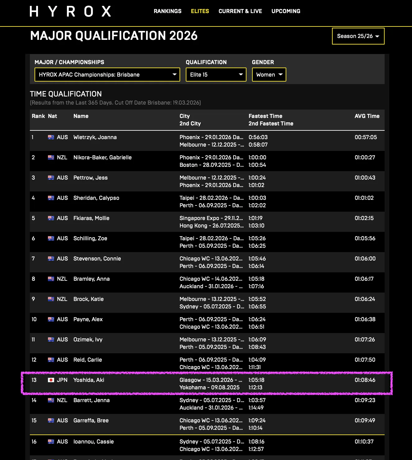 吉田選手のプロカテゴリーでの自己最速タイム1:05:18は、2026年3月11日現在APAC ELITE15の6位/15人枠に位置しており、オーストラリアやニュージーランドのトップアスリートたちと同じステージで競い合う実力を十分に持ち得ています。彼女が唯一の日本人・アジア系アスリートとしてELITE15に参戦し、世界中にライブ中継されることで、それを観る多くの人々が勇気づけられるでしょう。