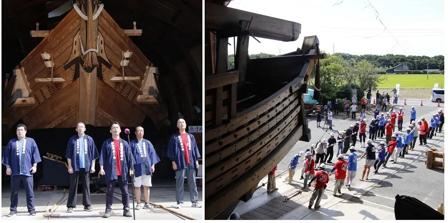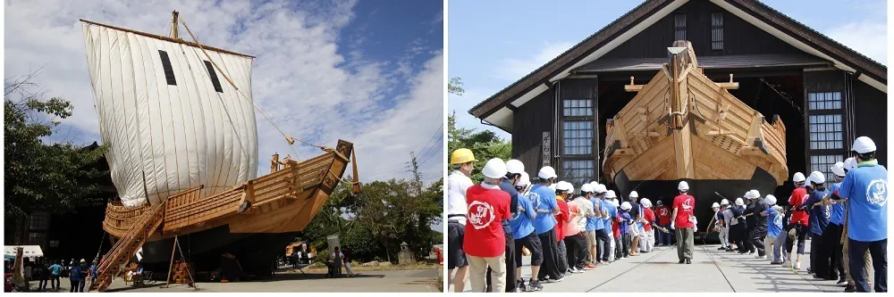 「白山丸」は完全復元千石船で、佐渡國小木民俗博物館の展示館で公開しています。年に一度、大勢の人が協力して展示館から前の広場に引き出し、160畳の大きさの帆を張って展示します。木遣りに合わせて船出します。