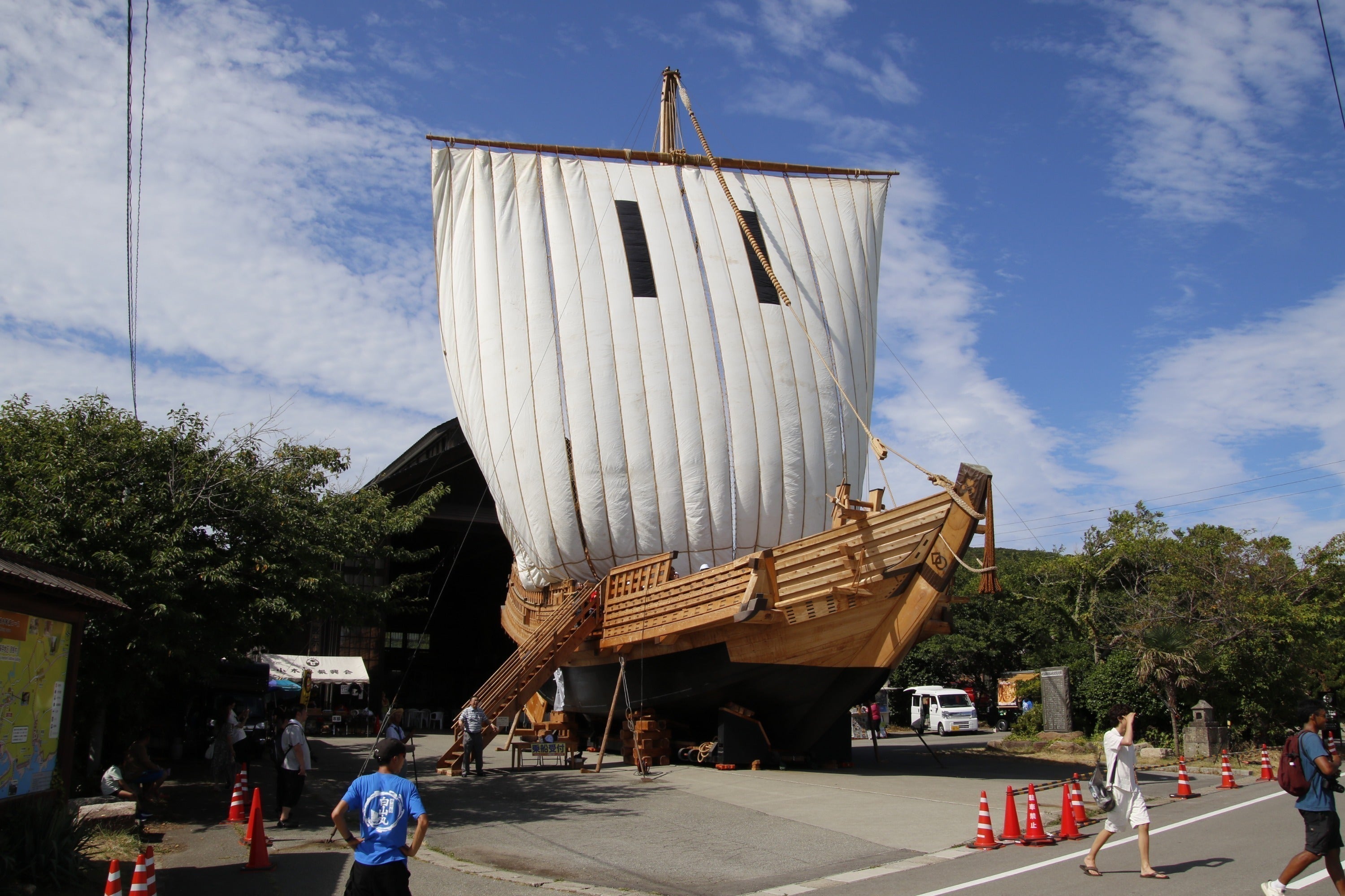 「白山丸」は完全復元千石船で、佐渡國小木民俗博物館の展示館で公開しています。年に一度、大勢の人が協力して展示館から前の広場に引き出し、160畳の大きさの帆を張って展示します。木遣りに合わせて船出します。