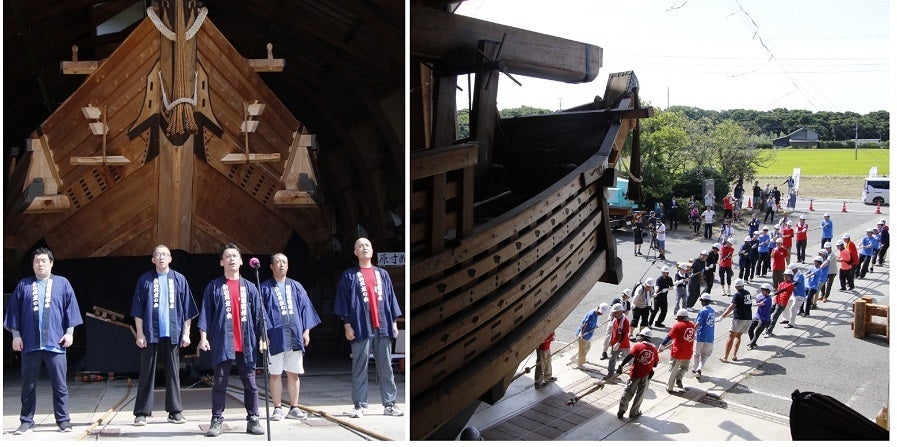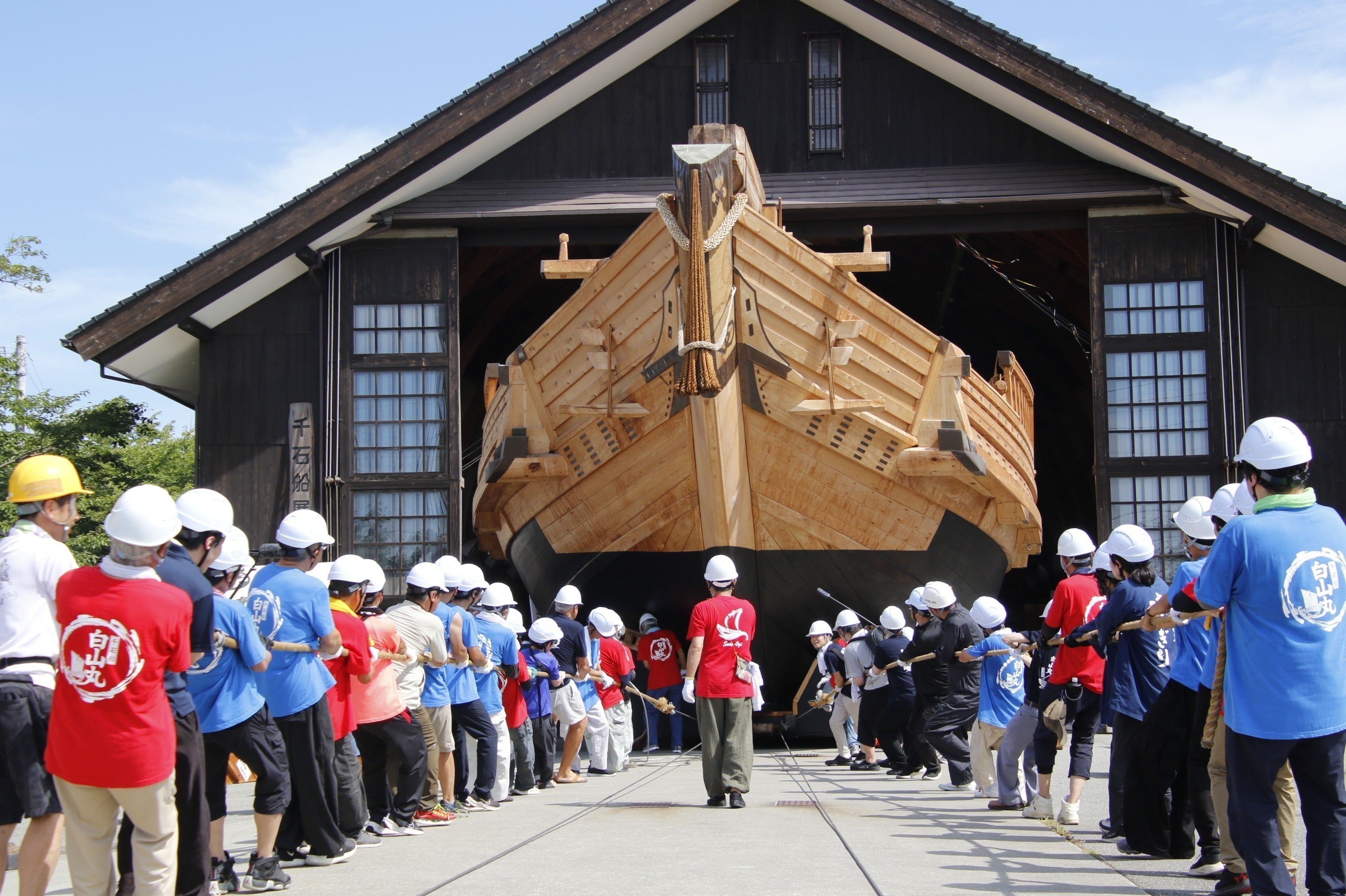 「白山丸」は完全復元千石船で、佐渡國小木民俗博物館の展示館で公開しています。年に一度、大勢の人が協力して展示館から前の広場に引き出し、160畳の大きさの帆を張って展示します。木遣りに合わせて船出します。