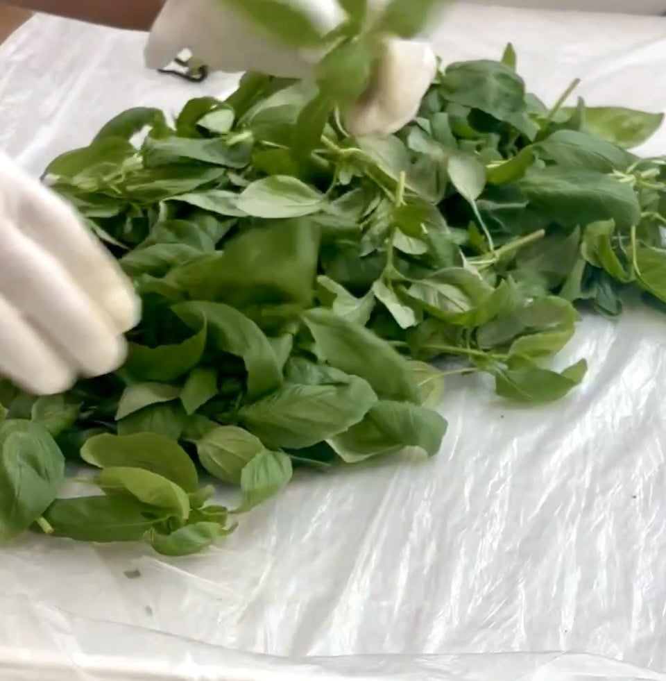 バジルの選果とは、収穫した葉を一枚ずつ丁寧に確認する作業のことです。葉の裏表を見ながら、虫食いや黒ずみ、キズがないかをしっかり検品しています。