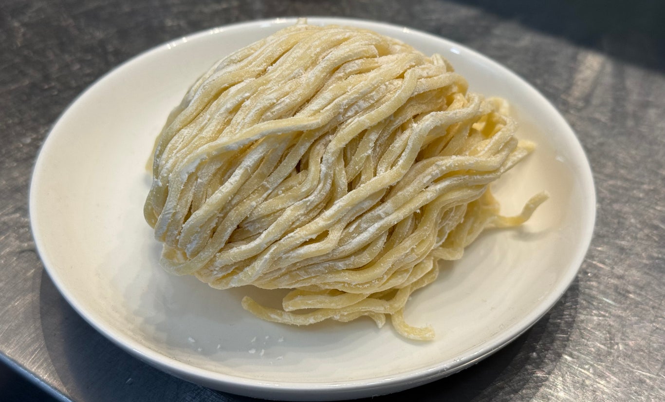 ② 油そば専用の特注麺はこの油そばのために作った特注の太麺。