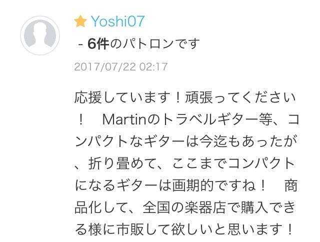 2018/12/17 01:27この度はCross Guitar2.0への皆様の多くのご支持をいただき本当にありがとうございました!皆様のお陰をもちまして、Cross Guitarの製作が無事進行する見通しが立ちました。現在既に工場へ発注済であり、2019年一月には送付の手続きを行い、皆様のお手元にお届けすることができそうな状態です。もし万が一、何かご要望、送付地変更等その他問題がございましたら、 campfireを通じてご連絡くださいますようよろしくお願い申し上げます。完成までどうぞご期待ください! もっと見る