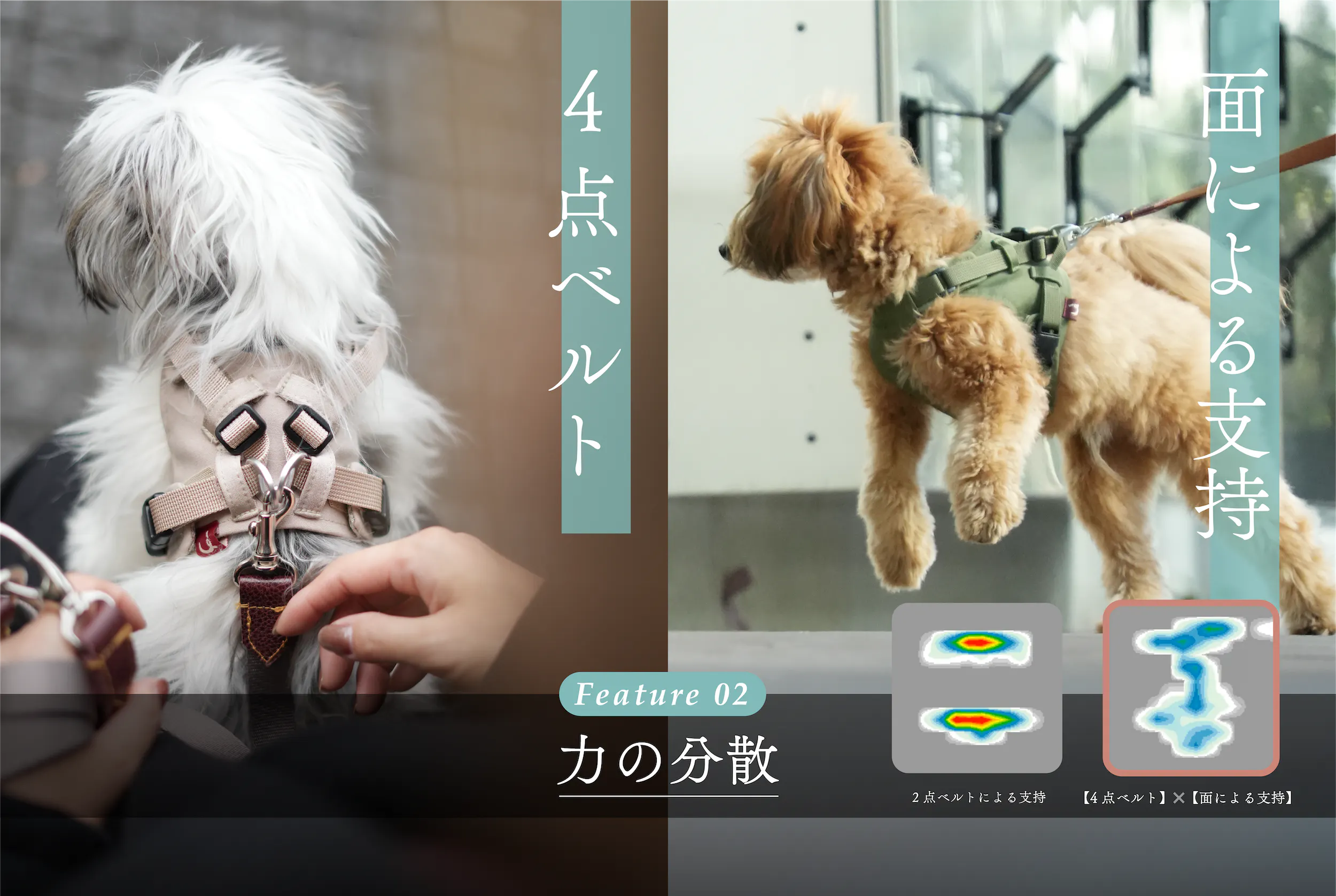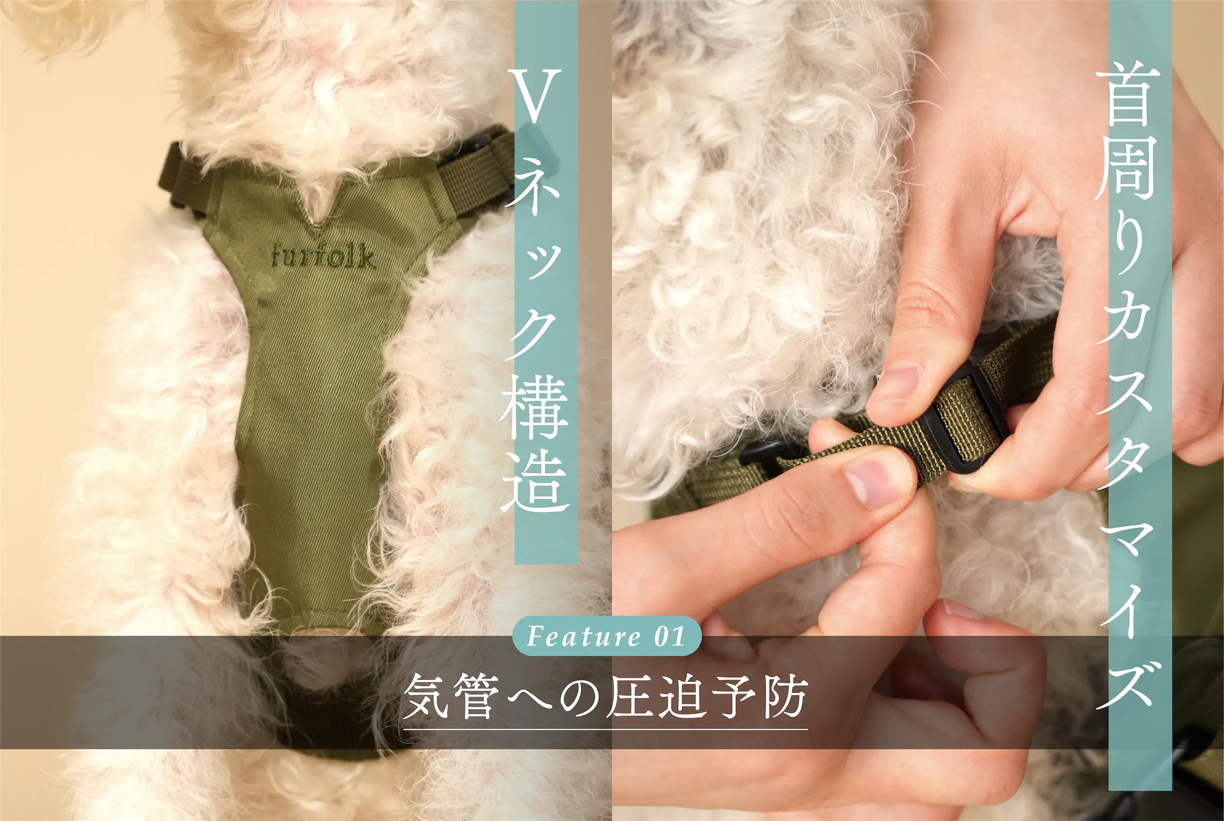 お散歩中の引っぱりで咳が出やすい子や、首の負荷に弱い子を想定して開発。特に小型犬は遺伝的に気管が弱い子が多いため、その子達が生涯、少しでも長くお散歩を楽しめるようにという想いを設計に込めました。