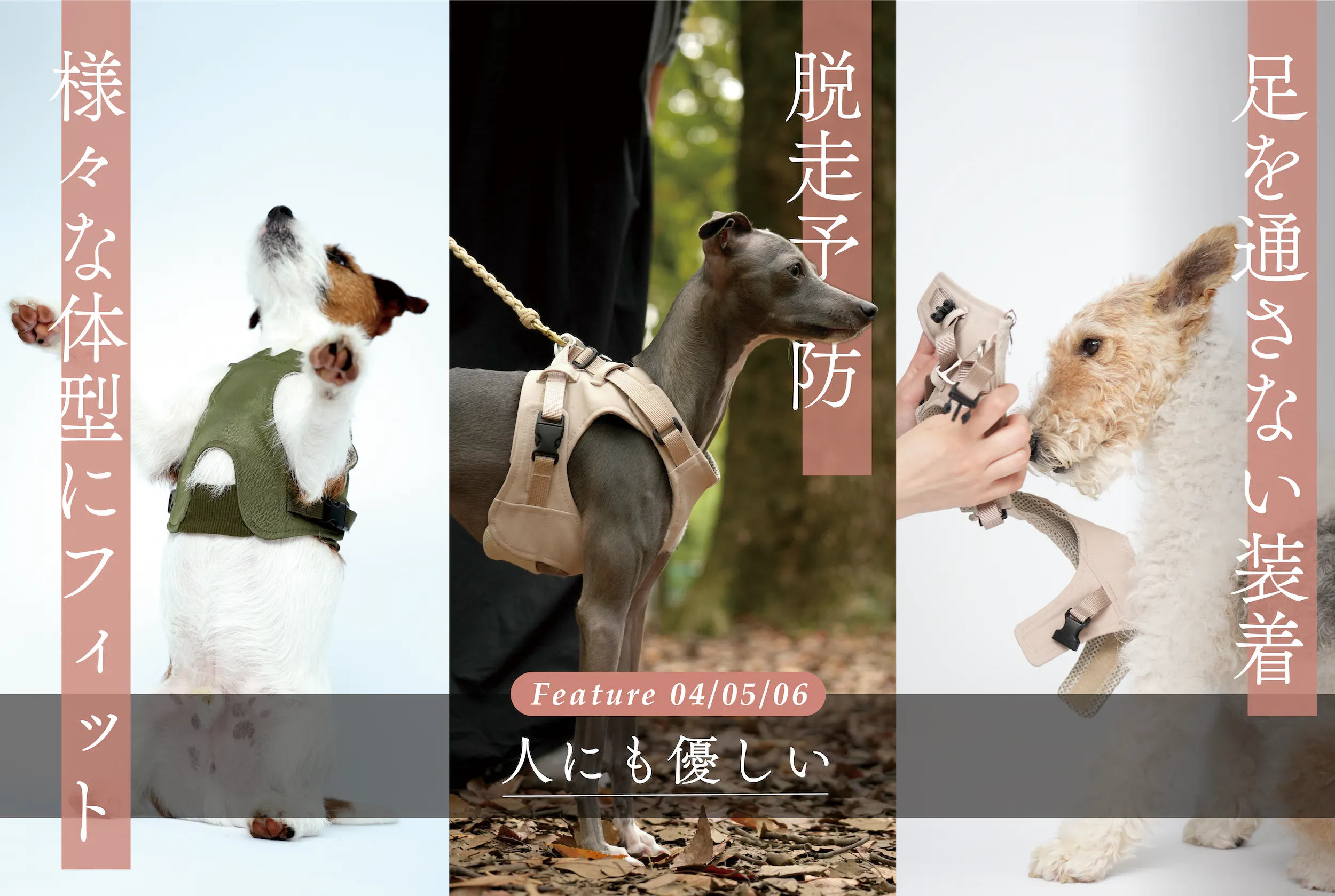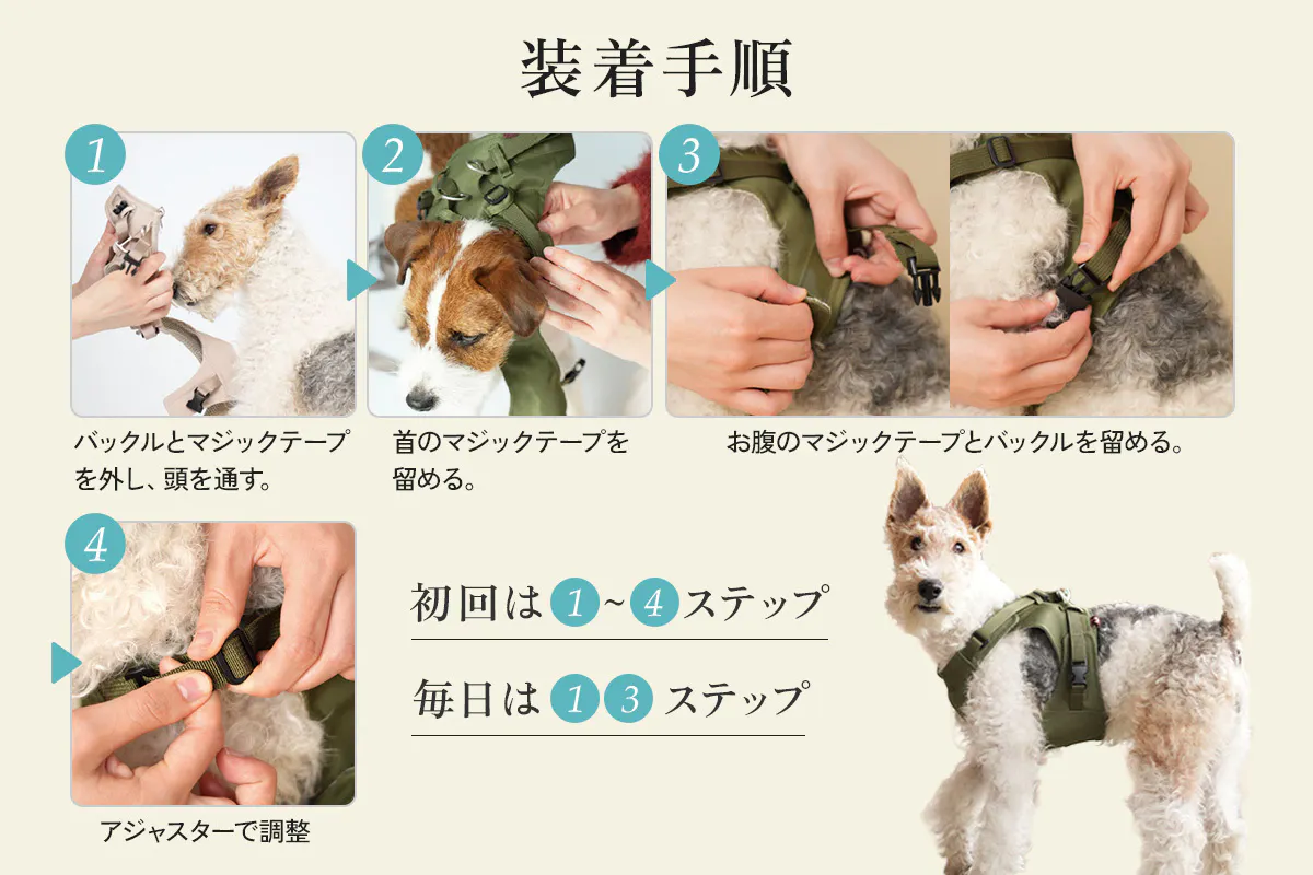 足を持たれるのが嫌い、じっとしているのが苦手、シニアで足が上げにくいーーー。そんな様々な個性を持つ子達にも装着しやすいように考えたハーネスです。「お散歩に連れていってあげたいのに、連れて行くまでが大変」。そんな飼い主さまの優しさと苦労に寄り添う設計です。