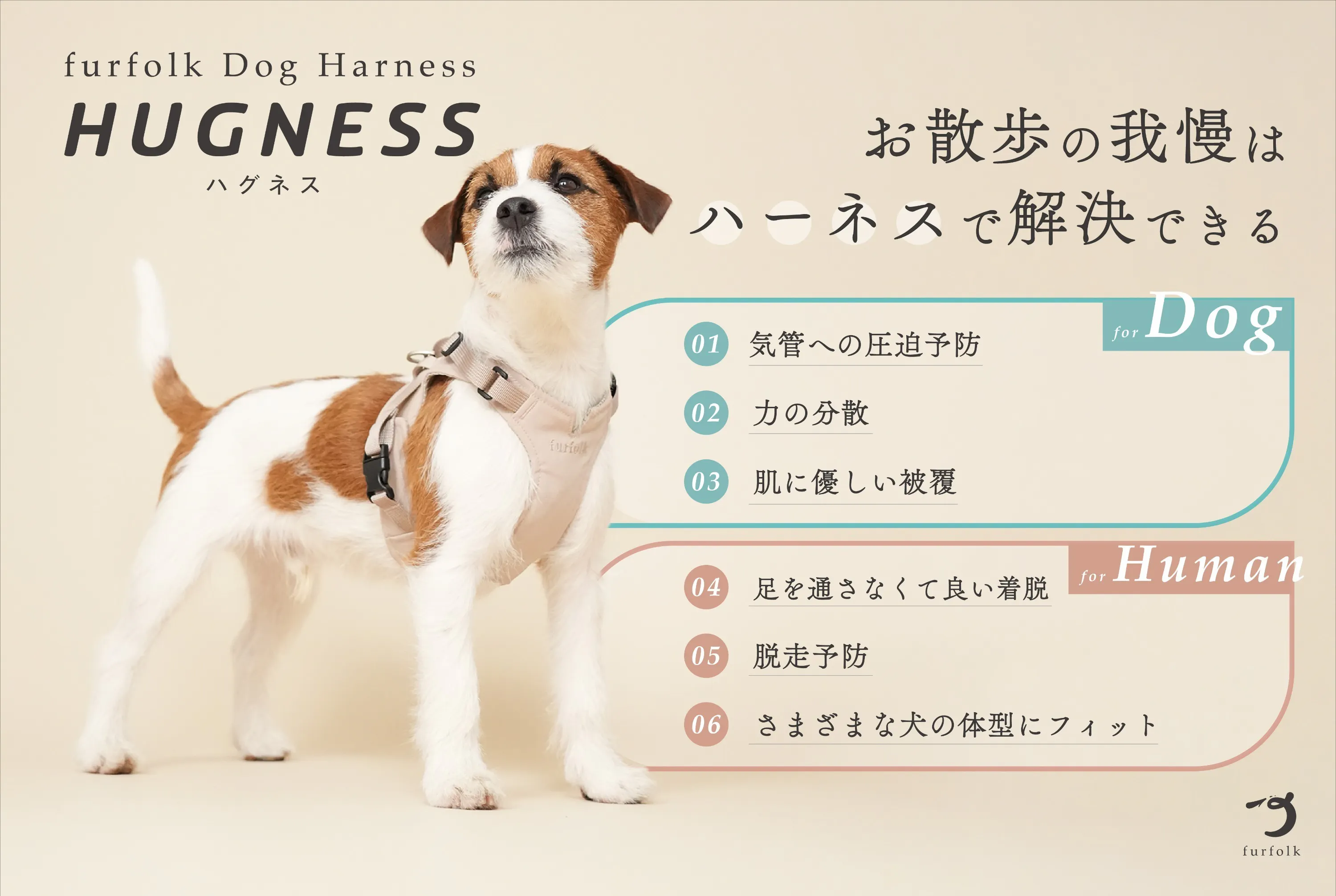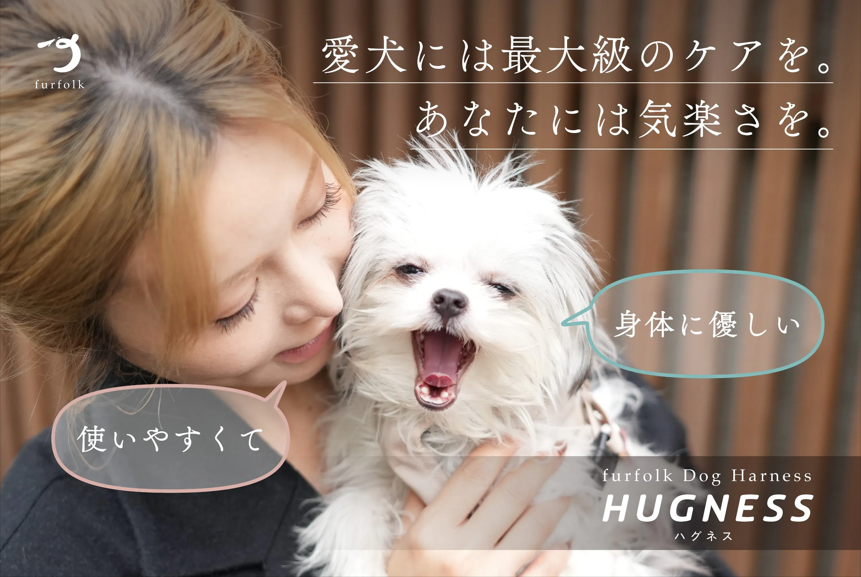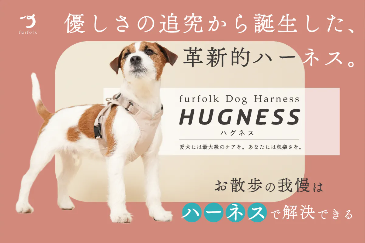 「けむくじゃらの家族。しあわせを、もっと。」をブランドスローガンに掲げるドッグライフブランド「furfolk(ファーフォーク)」より、愛犬の身体への負担を軽減しながら、人の使いやすさにもこだわり抜いた、新しいハーネス「furfolk Dog Harness【HUGNESS(ハグネス)】」が誕生しました。