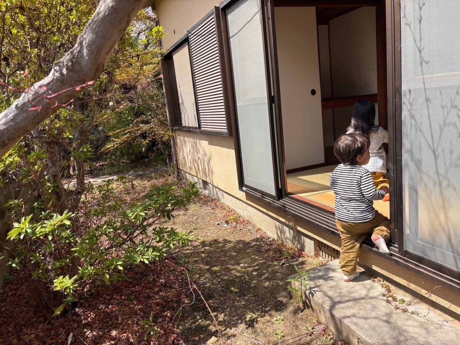 さくらやつつじが咲くお庭では、子どもたちが遊び、