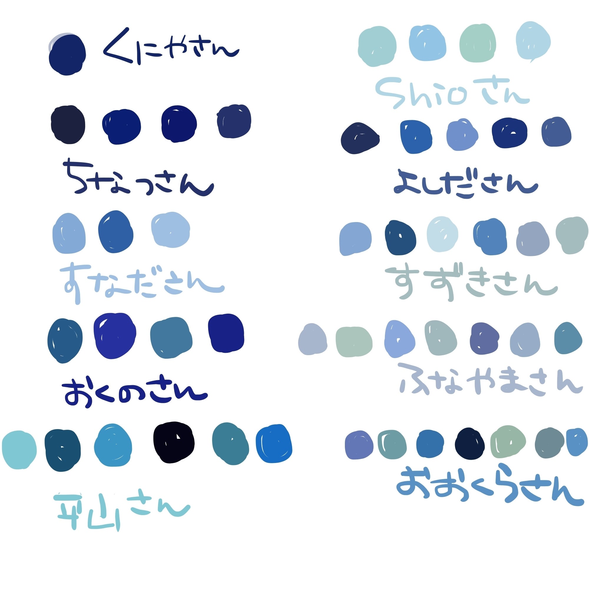 ここから色のバランスをみながら、各作家の青をどれにするかの選定作業をして、色の帯と作家名を並べていきます。