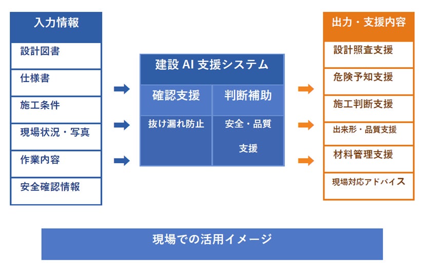 目指しているのは、設計照査、安全管理、施工判断、出来形管理、品質管理、材料管理など、建設実務のさまざまな場面で役立つAI支援です。現場で使いにくい机上の仕組みではなく、実務の流れに沿って使えることを重視しています。