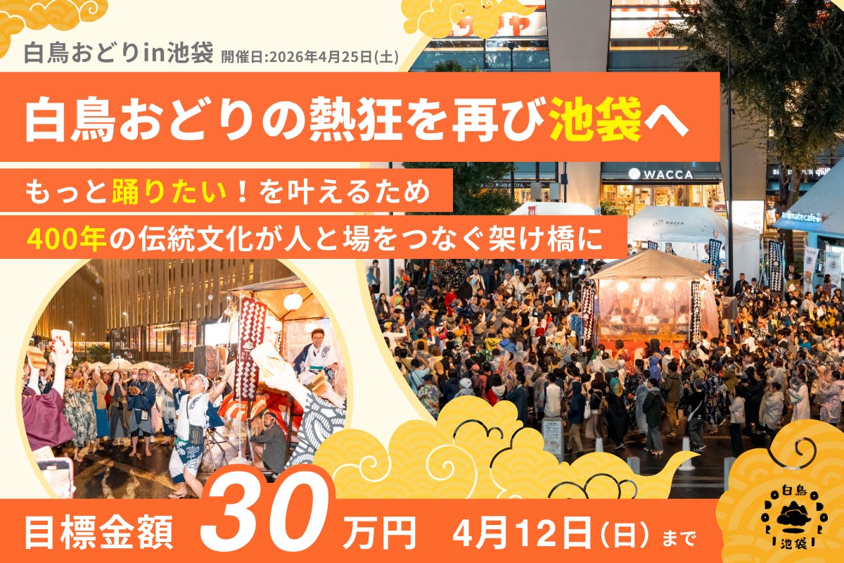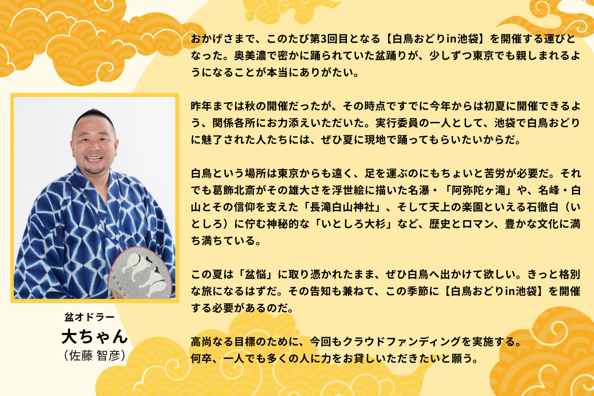 この度は本プロジェクトをご覧いただき、ありがとうございます。白鳥おどりin池袋実行委員会で企画・運営を担当するオドルキカクの前田泰伸と申します。