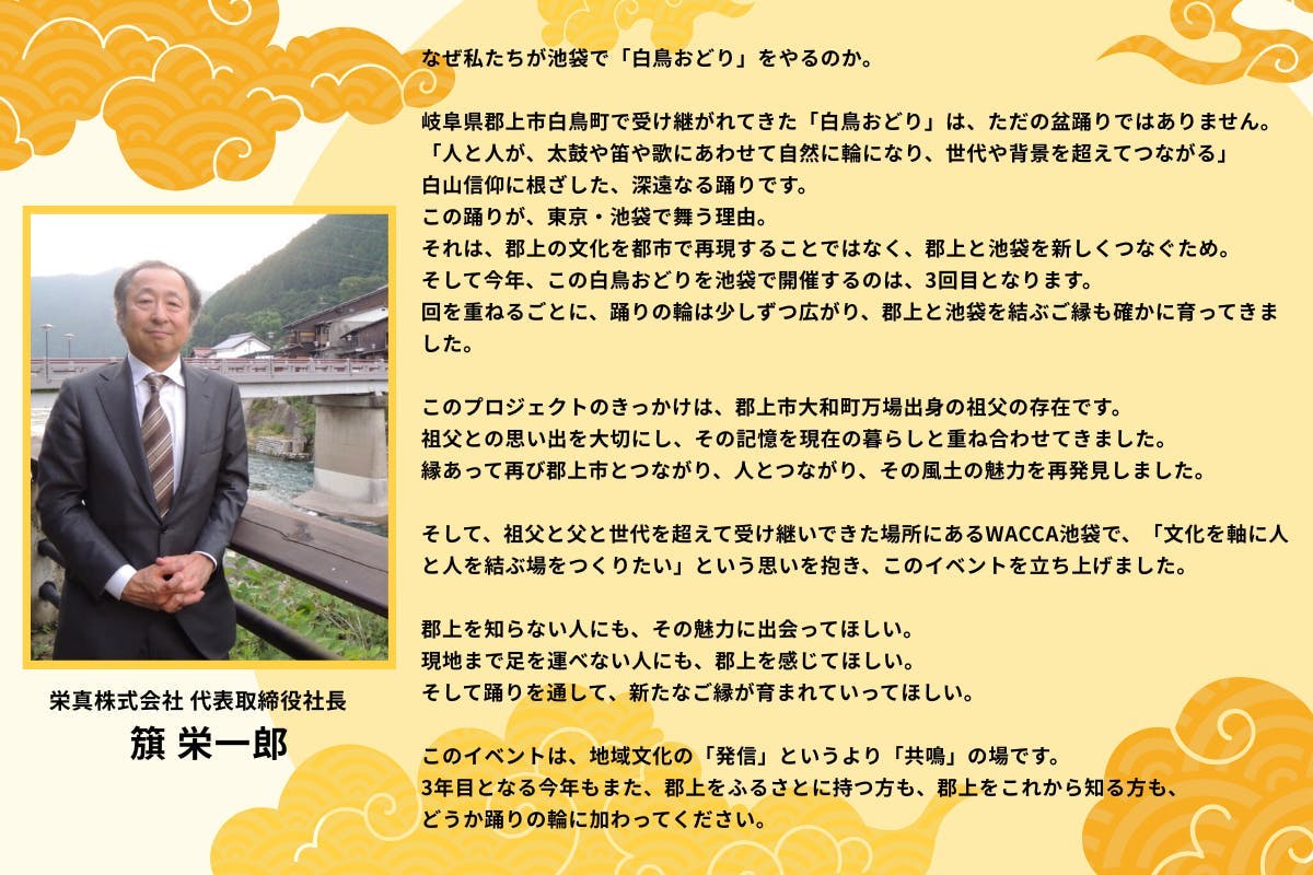 それは、単に文化を再現したいからではありません。郡上の「不屈の精神」と池袋の街を新しい縁で結び、未来へ繋いでいきたいからです。文化を守るだけでなく、新しい縁を生む挑戦です。