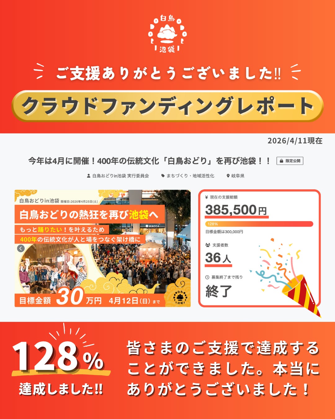 皆さまお一人おひとりの「今年も東京・池袋で白鳥おどりを!」という想いが