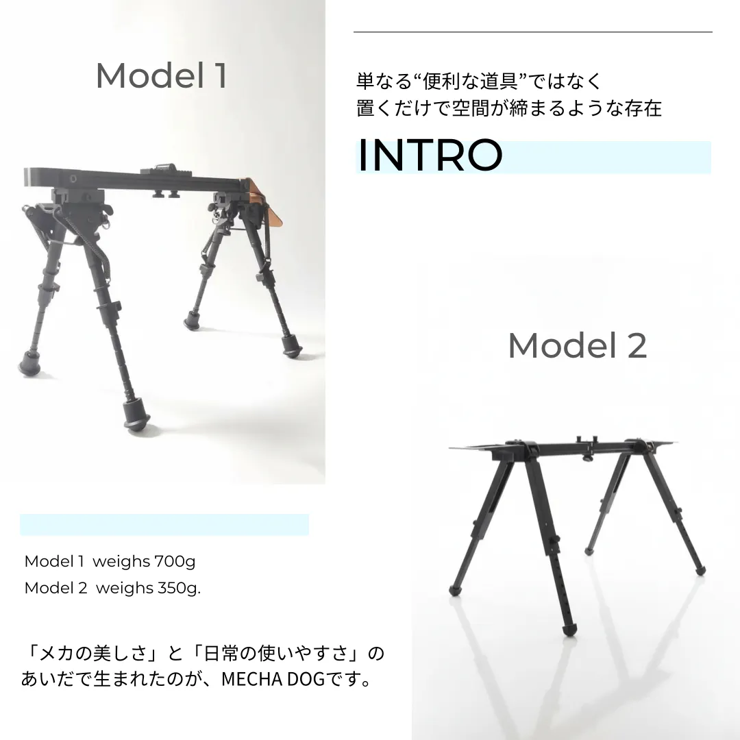 『機銃犬』は、機甲的な造形を持った小型折りたたみテーブルです。光と影を美しく拾う彫刻のようなルックスをもちながら、実用性も両立。