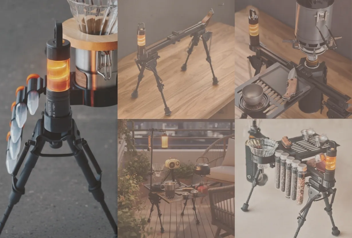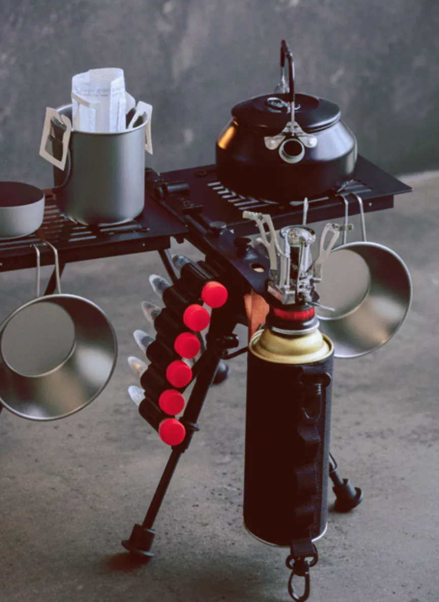 『機銃犬』は、手に入れた時点が終わりではありません。そこからが、ユーザーの発想によって独自のギアへと進化していく「無限のカスタムの始まり」なのです。 メインフレームに組み込まれた独自のレールシステムは、市販のアウトドアギアやDIYパーツとシームレスに結合します。