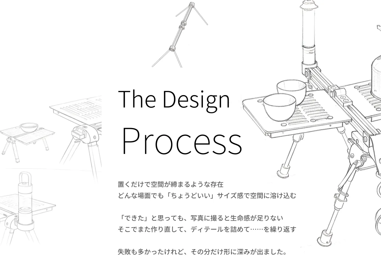 キャンプや限られた生活空間、撮影といった日常の些細な瞬間も大切にしています。