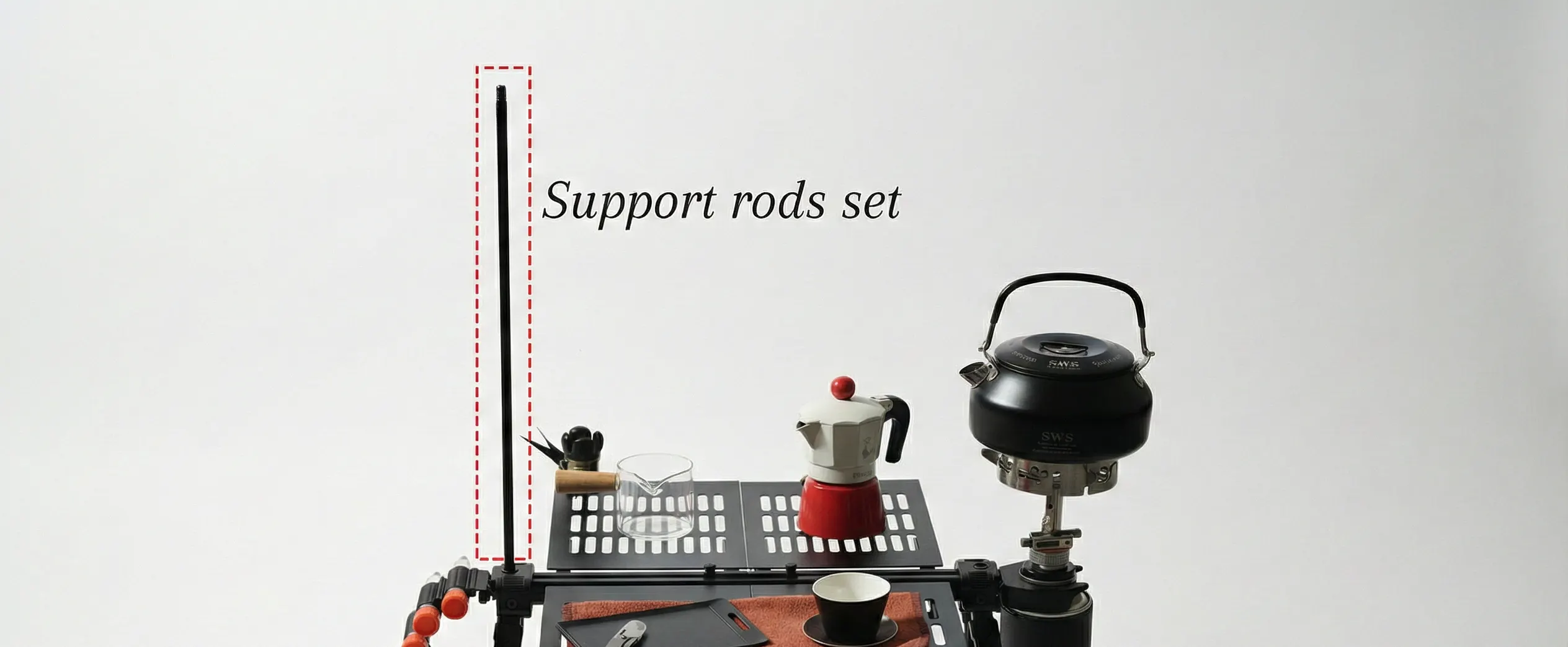 調理などで火器を使用する際、ガスカートリッジ(ガス缶)などをテーブルの側面に拡張して吊り下げる使い方は極力お避けください。万が一バランスを崩してテーブルが転倒した場合、火傷や火災などの重大な事故につながる恐れがあります。火器を扱う際は、全体の荷重バランスに十分ご注意いただき、極めて安全な状態でご使用ください。