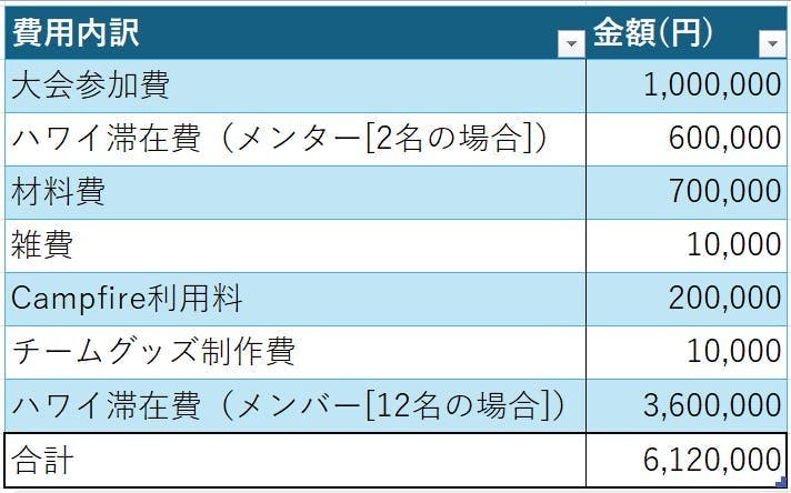 FRCでは、大会に向けたロボットをほとんどゼロから製作します。そのため、工具や部品の購入、製作場所の確保、ロボット製作の設備などが必要となり、質の高いロボットを作り安全に輸送するためだけでも、約100万円の費用がかかります。これにハワイへ行くための渡航費や滞在費、その他の費用をすべて含めると金額は600万円近くになります。