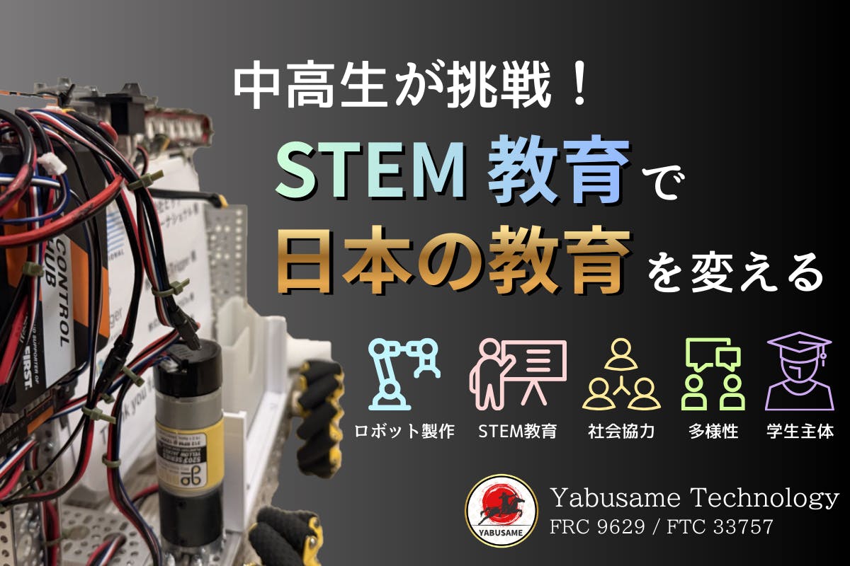 Yabusame Technology は、STEM 教育の普及を目的として活動する、学校横断型の中高生チームです。2027 年 3 月頃に開催される” FIRST Robotics Competition “へ出場し、その先にあるヒューストンでの世界大会への進出を目指しています。