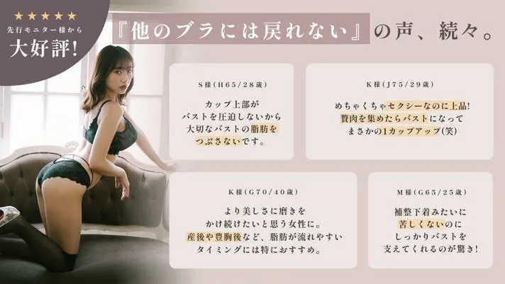 「美への投資を惜しまない女性へ。という価値観に共感しました。実際に着けてみて、素材、縫製、ディティール、デザイン、ホールド力すべて、その品質の高さに納得しました。より美しさに磨きをかけ続けたいと思う女性に、ぜひ試してほしいです。産後や豊胸後のバストなど、脂肪が流れやすいタイミングには特におすすめ。」