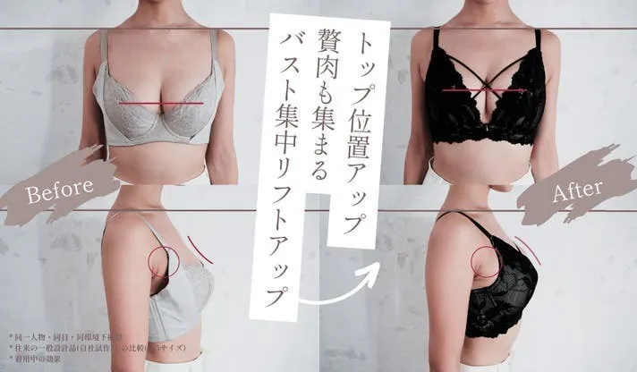 脇や背中に流れがちな贅肉を、バスト中央にしっかり寄せ集めて逃さない設計。自然で美しい谷間を演出。