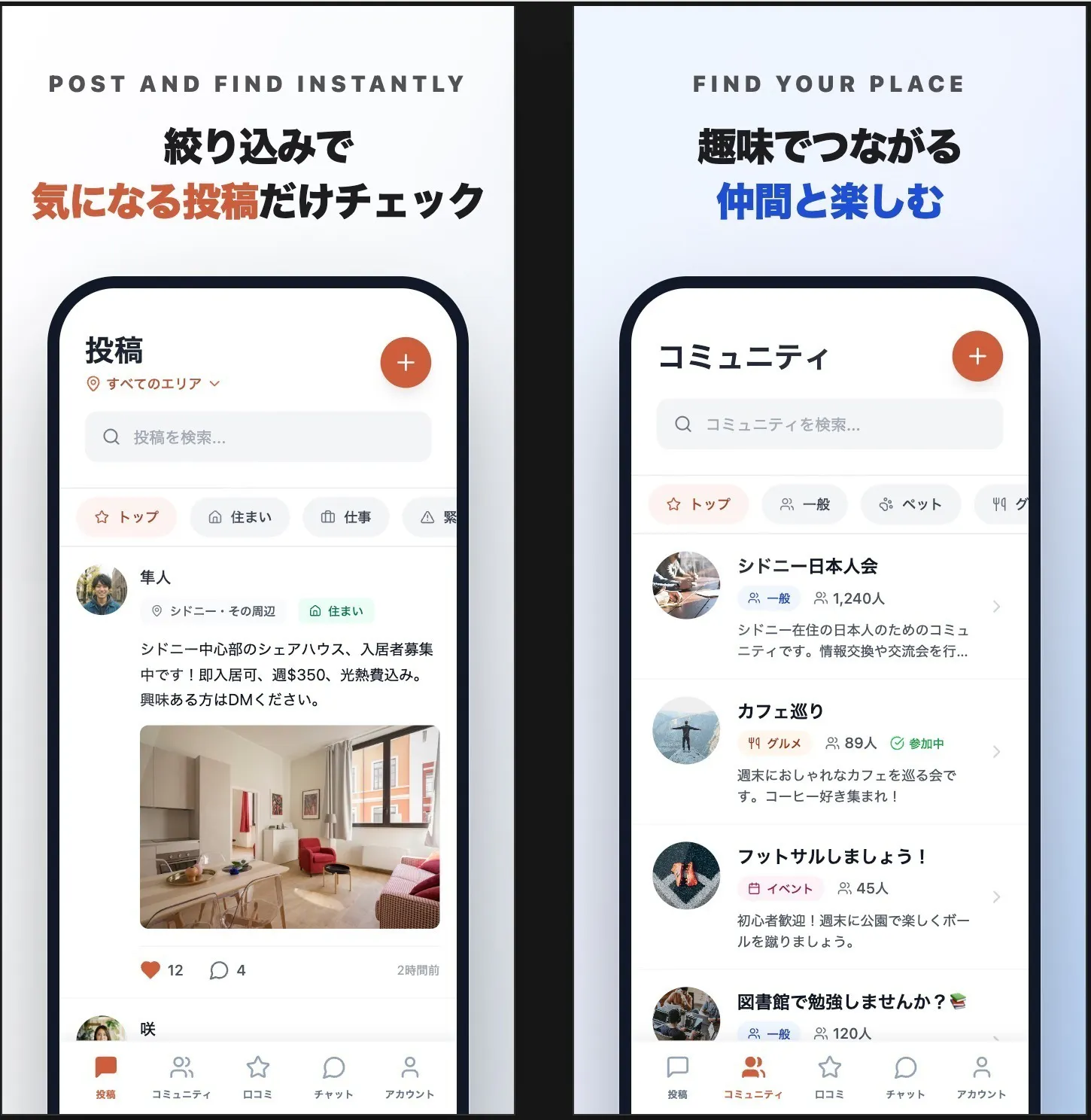 など、海外生活に必要な情報をカテゴリー別に簡単に共有することができます。