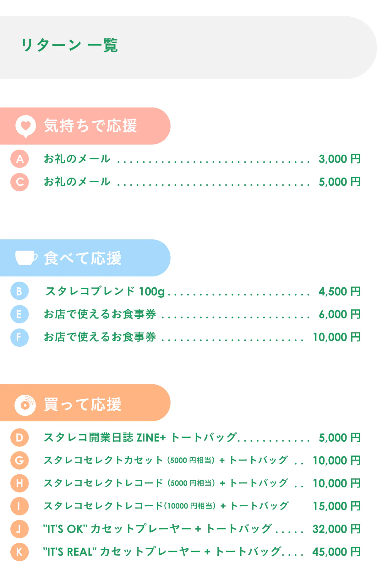 支援していただいた皆様には、お楽しみいただけるリターンをご用意しています。それぞれの金額に応じて、私たちの想いを込めたアイテムや体験をお届けします。