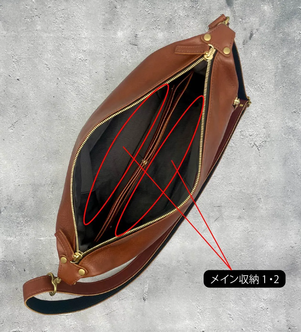 中央ポケットが仕切りの役割になり、メイン収納は分けて入れることが出来ます。