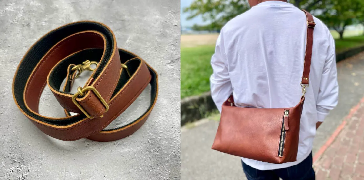 操作性を重視してアクリルテープと革のコンビにしました。革も使うことで本体との一体感が生まれ、高級感が増します。また肩掛けした時に滑り落ちにくく、かけ心地が良いです。ショルダー紐の長さは、約82㎝~150㎝の調節ができます。(ナスカン含む)