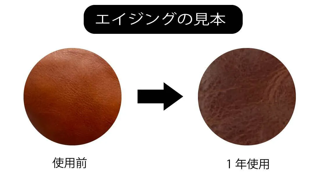高品質で上質なオイルワックスを4回も塗り込むことで、革を折り曲げたり、引っ張ったりした時にオイルが繊維内を移動し、常に革表情が変化し、『ヴィンテージな風合い』に経年変化(エイジング)していきます。