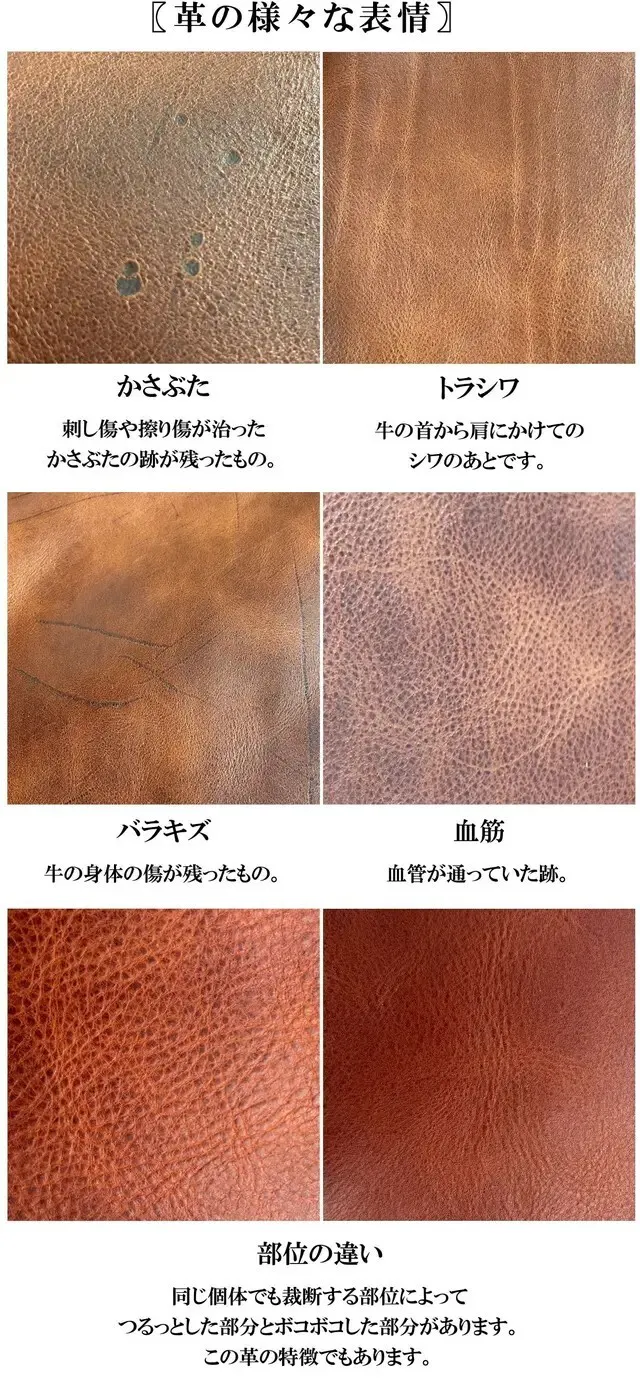 本革には合成皮革にはない牛が生きていた証の印があります。元々の素材を生かした仕上げの為、その牛が持っていたキズ、シワ、血管、毛穴などの天然の刻印がよくみられるのが特徴です。これらは身体の部位や個体差で一つ一つ表情が異なります。世界に2つとない自分だけの特別な革をじっくりとご覧ください。