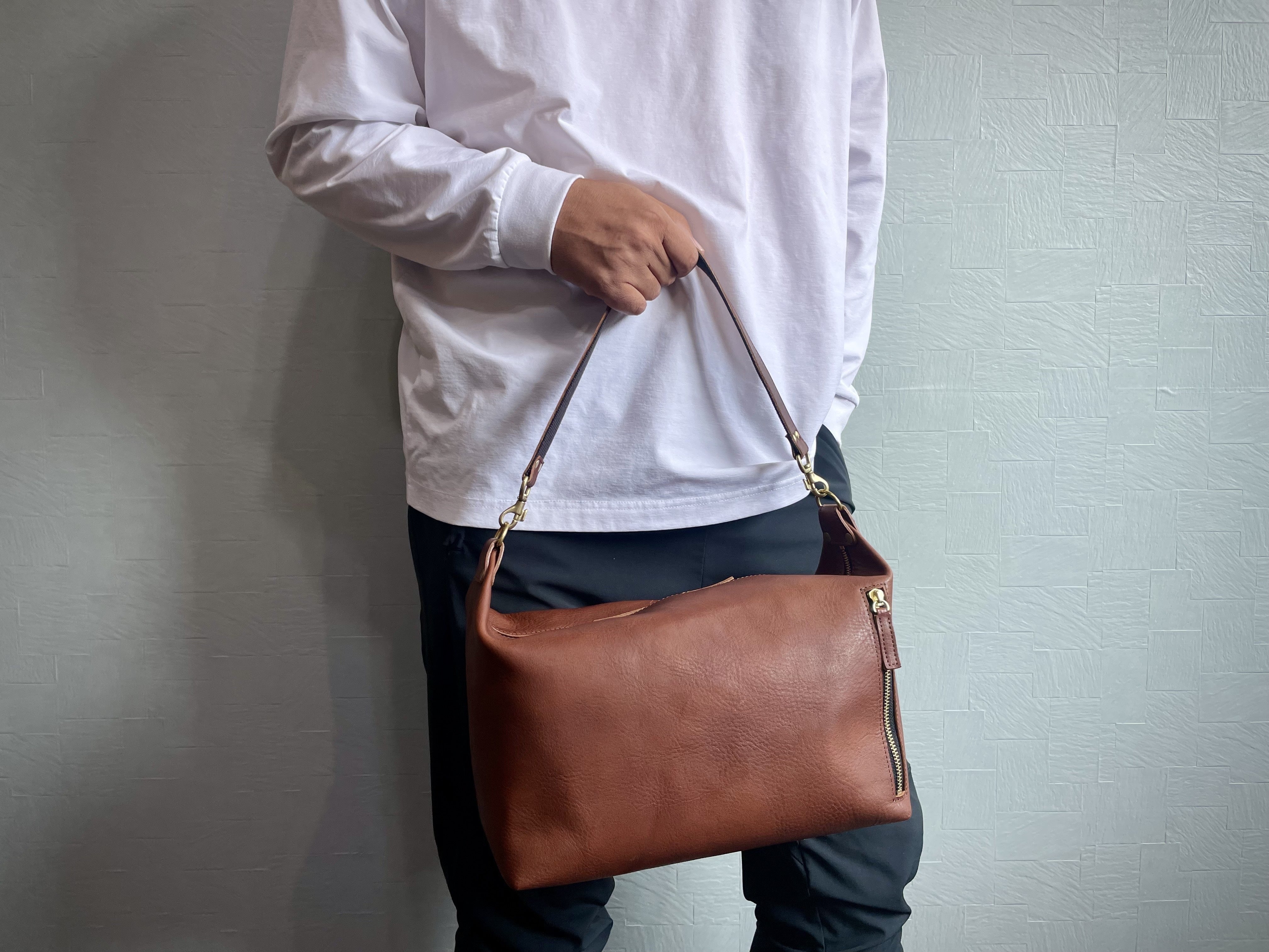 大きすぎず、小さすぎずの使いやすさを重視したショルダーバッグが出来上がりました。ワイルドにガシガシ使い込み、味を深めて相棒として長く使ってほしい。そんな思いを込めました。