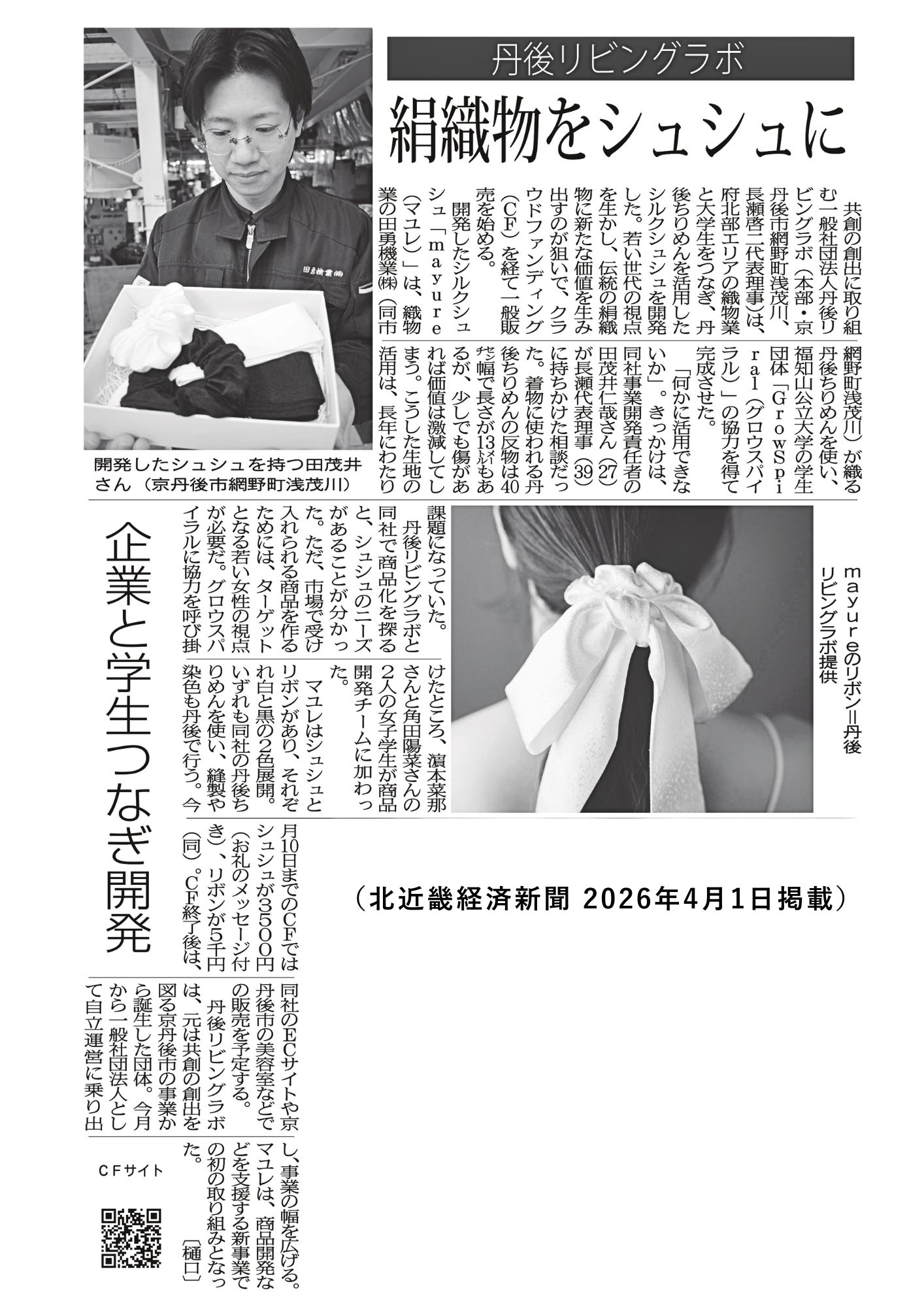 このたび、北近畿経済新聞(2026年4月1日付)にて、本プロジェクトおよびシルクシュシュ「mayure」をご紹介いただきました。