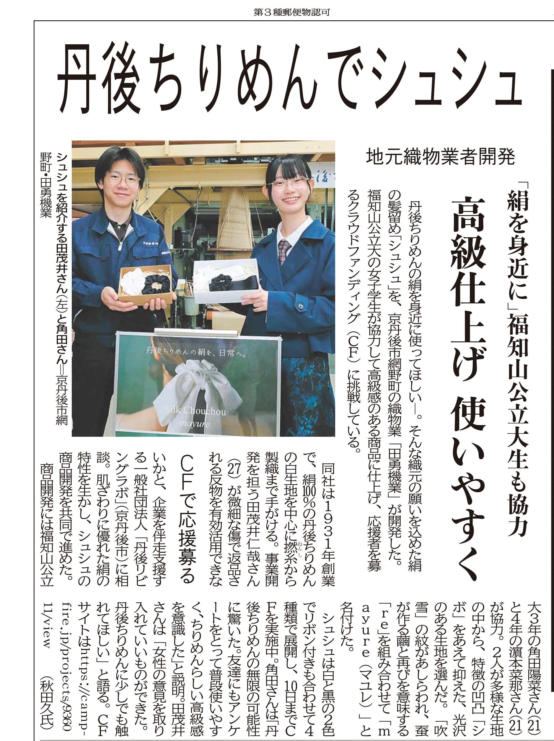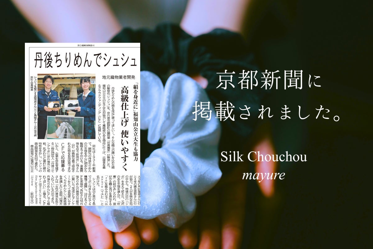 本日、2026年4月3日付の京都新聞にて、シルクシュシュ「mayure」とクラウドファンディングの取り組みが掲載されました。